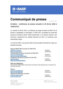 Le vendredi 23 février 2024, la conférence de presse annuelle de BASF SE se tiendra à Ludwigshafen, en Allemagne. À 12h00 (CET), le président du conseil des directeurs exécutifs de BASF, Martin Brudermüller, et le directeur financier, Dirk Elvermann, présenteront les résultats financiers de 2023. La conférence sera retransmise en ligne.
