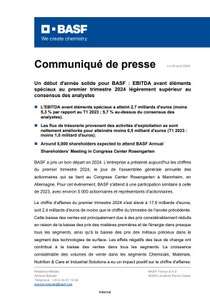 Un début d'année solide pour BASF : EBITDA avant éléments spéciaux au premier trimestre 2024 légèrement supérieur au consensus des analystes