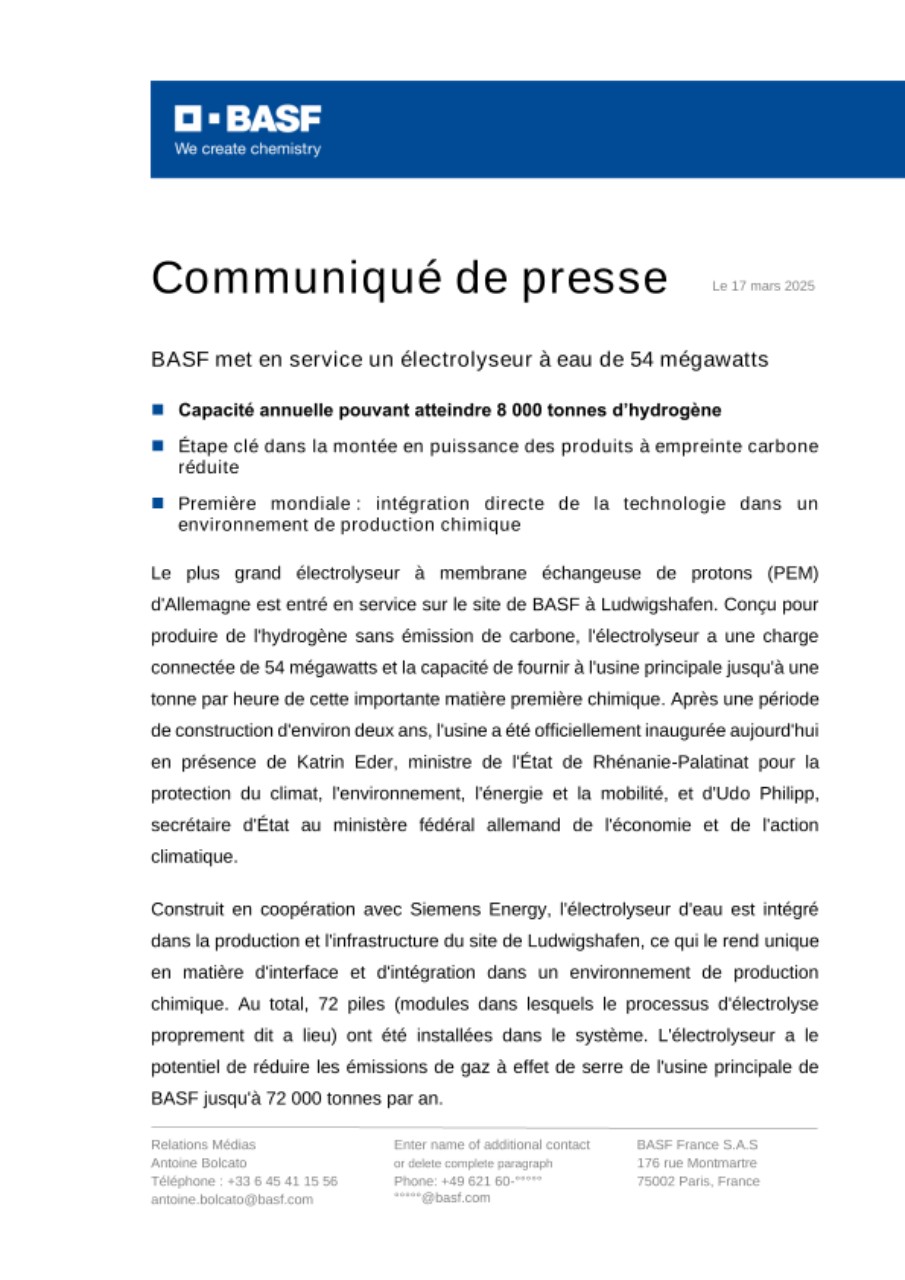 Katrin Eder, ministre d'État de Rhénanie-Palatinat pour la protection du climat, l'environnement, l'énergie et la mobilité, a ajouté : « BASF s'est engagée sur la voie ambitieuse du zéro émission nette. En plus d'augmenter progressivement sa production d'électricité et de chaleur industrielle à partir d'énergies renouvelables, l'entreprise prévoit également d'utiliser des matières premières renouvelables comme alternatives aux sources d'énergie fossiles actuellement utilisées, telles que le gaz naturel. Conçu pour produire de l'hydrogène vert comme matière première, le nouvel électrolyseur du site de Ludwigshafen représente une étape importante et contribue à la réalisation des objectifs de protection du climat de la Rhénanie-Palatinat. »