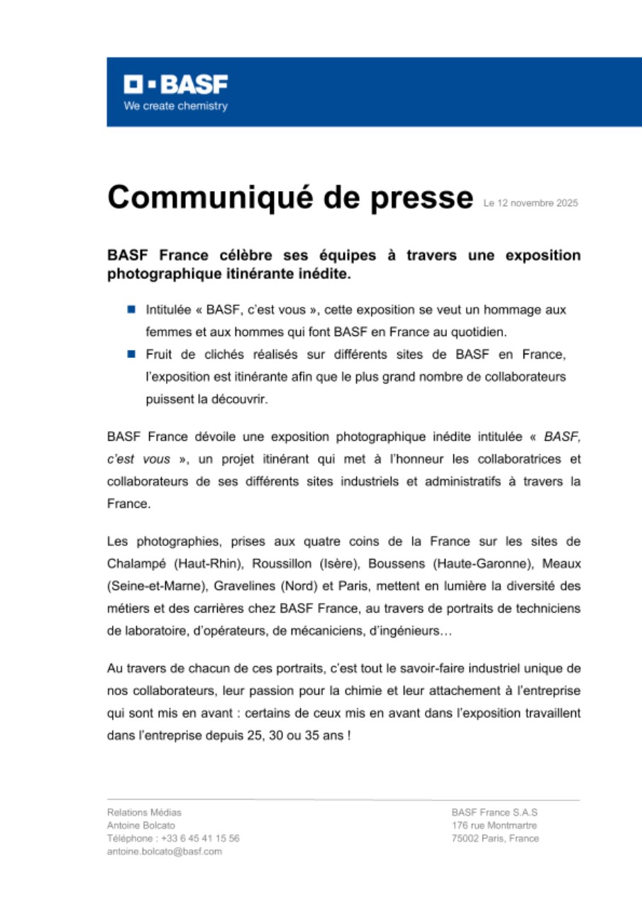 - Intitulée « BASF, c’est vous », cette exposition se veut un hommage aux femmes et aux hommes qui font BASF en France au quotidien.