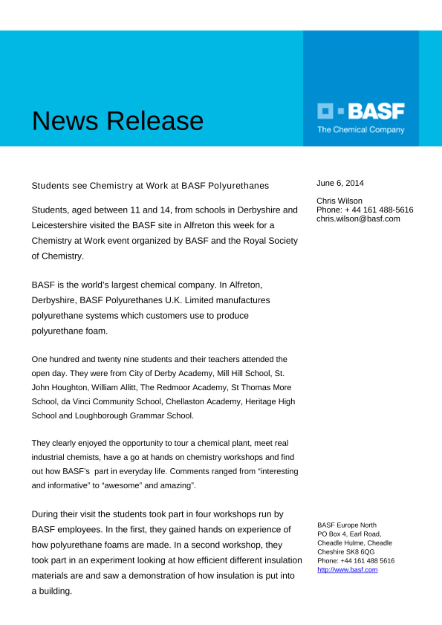 Students, aged between 11 and 14, from schools in Derbyshire, Leicestershire and Nottinghamshire visited the BASF Polyurethanes site in Alfreton this week for a Chemistry at Work event organized by BASF and the Royal Society of Chemistry.
