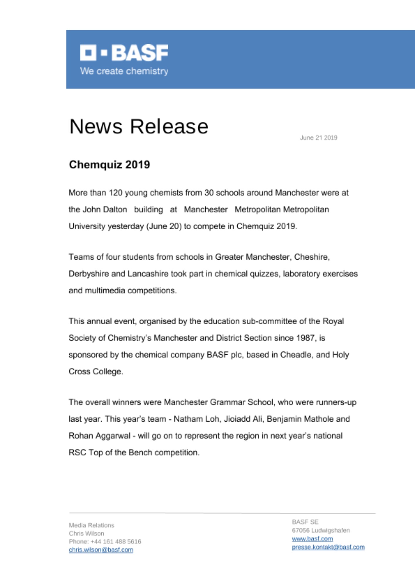 This annual event, organised by the education sub-committee of the Royal Society of Chemistry’s Manchester and District Section since 1987, is sponsored by the chemical company BASF plc, based in Cheadle, and Holy Cross College.