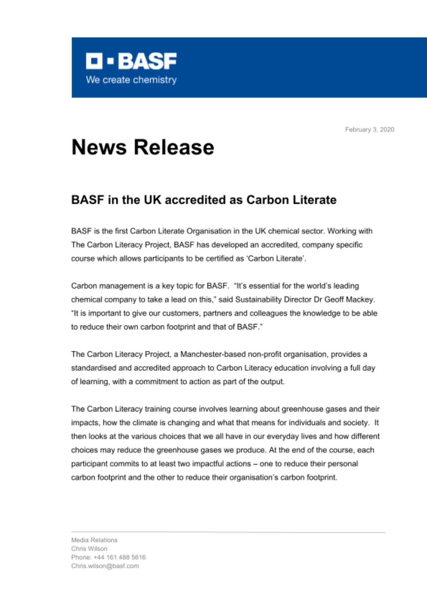 BASF is the first Carbon Literate Organisation in the UK chemical sector. Working with The Carbon Literacy Project, BASF has developed an accredited, company specific course which allows participants to be certified as ‘Carbon Literate’.