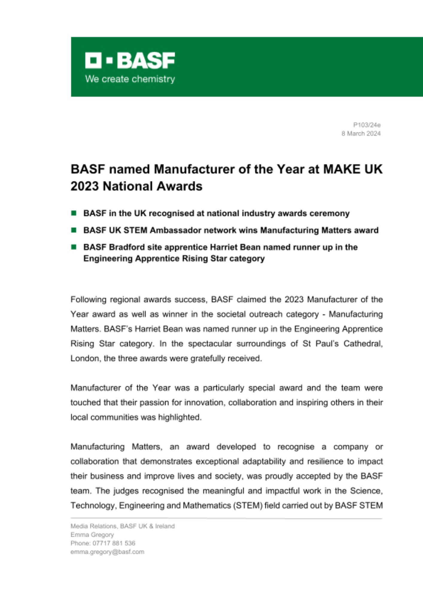 - BASF UK STEM Ambassador network wins Manufacturing Matters award