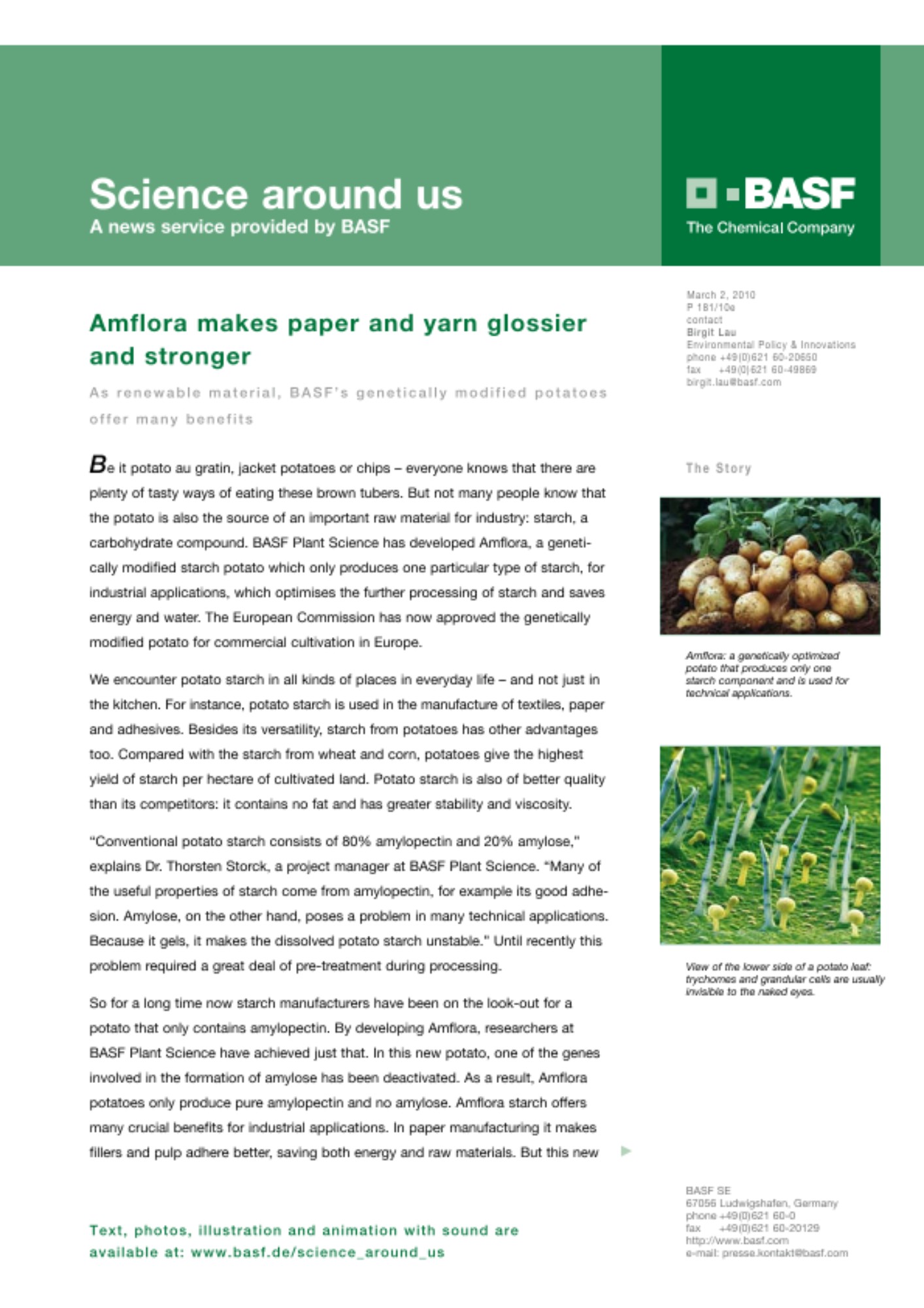 Be it potato au gratin, jacket potatoes or chips - everyone knows that there are plenty of tasty ways of eating these brown tubers. But not many people know that the potato is also the source of an important raw material for industry: starch, a carbohydrate compound. BASF Plant Science has developed Amflora, a genetically modified starch potato which only produces one particular type of starch, for industrial applications, which optimises the further processing of starch and saves energy and water.