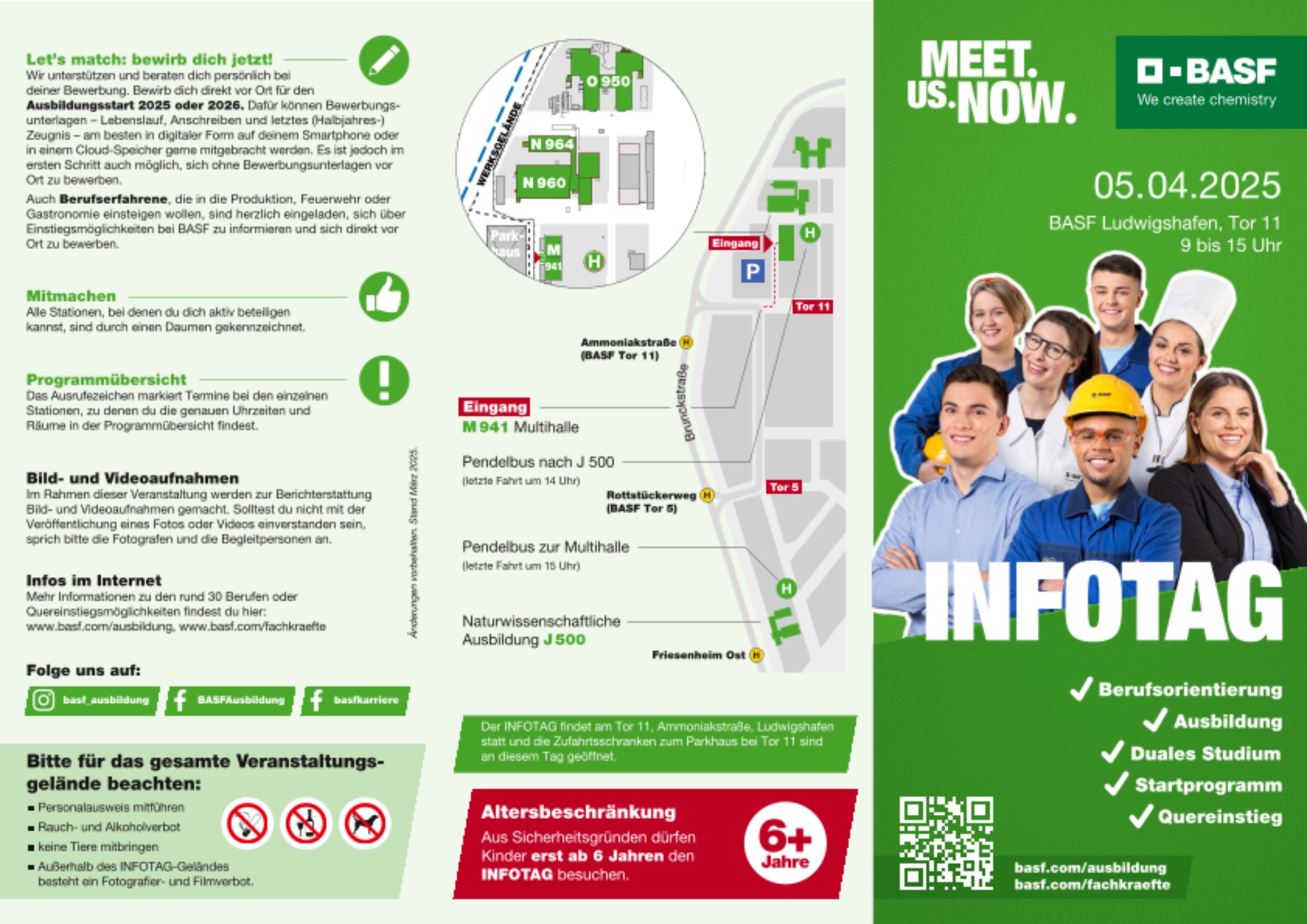 - Praxisnahe Einblicke, berufsbezogene Mitmachaktivitäten und informative Vorträge rund um Ausbildung bei BASF.