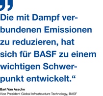 Während DAS Biogas und Dat Bike CO2-arme Technologien auf die Bedürfnisse von Haushalten und Individuen anpassen, skaliert BASF Ansätze auf industrielles Niveau, die es auch in Privathaushalten gibt. Etwa die Hälfte des heutigen CO2-Fußabdrucks von BASF stammt aus der Energieerzeugung. Von diesen 11 Millionen Tonnen entfallen 6 auf die Erzeugung von Dampf. „Die mit Dampf verbundenen Emissionen zu reduzieren, hat sich für BASF zu einem wichtigen Schwerpunkt entwickelt“, erklärt Bart Van Assche, Vice President bei BASF in Antwerpen/Belgien.