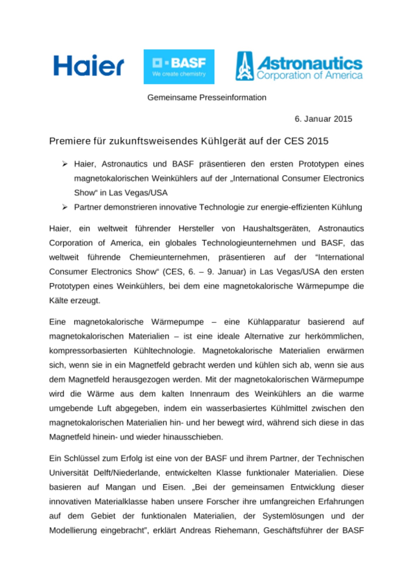 - Haier, Astronautics und BASF präsentieren den ersten Prototypen eines magnetokalorischen Weinkühlers auf der „International Consumer Electronics Show“ in Las Vegas/USA