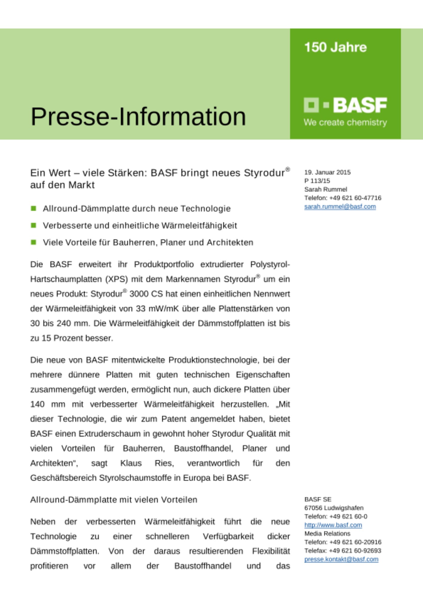 Die neue von BASF mitentwickelte Produktionstechnologie, bei der mehrere dünnere Platten mit guten technischen Eigenschaften zusammengefügt werden, ermöglicht nun, auch dickere Platten über 140 mm mit verbesserter Wärmeleitfähigkeit herzustellen. „Mit dieser Technologie, die wir zum Patent angemeldet haben, bietet BASF einen Extruderschaum in gewohnt hoher Styrodur Qualität mit vielen Vorteilen für Bauherren, Baustoffhandel, Planer und Architekten“, sagt Klaus Ries, verantwortlich für den Geschäftsbereich Styrolschaumstoffe in Europa bei BASF.