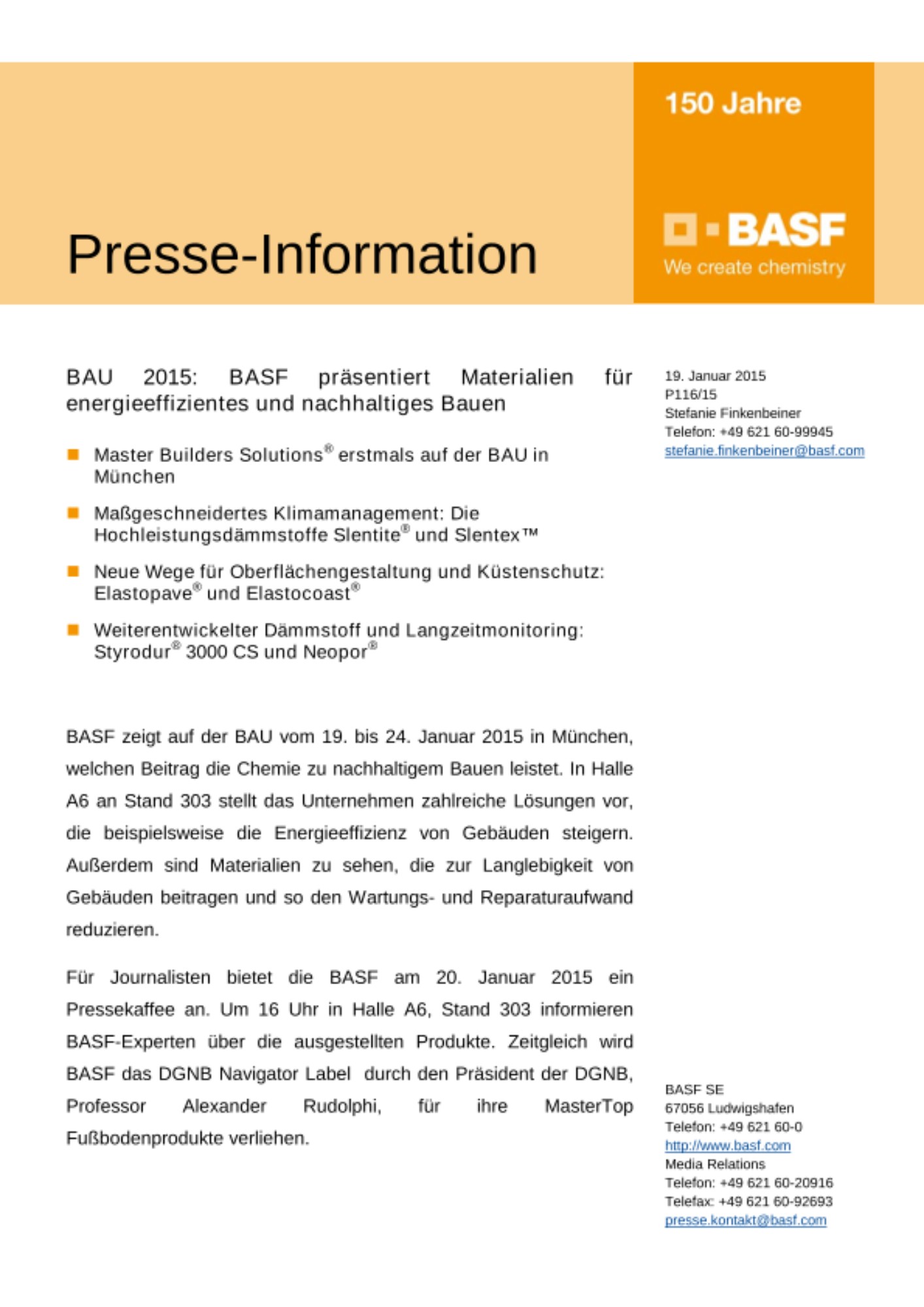 Für Journalisten bietet die BASF am 20. Januar 2015 ein Pressekaffee an. Um 16 Uhr in Halle A6, Stand 303 informieren BASF-Experten über die ausgestellten Produkte. Zeitgleich wird BASF das DGNB Navigator Label durch den Präsident der DGNB, Professor Alexander Rudolphi, für ihre MasterTop Fußbodenprodukte verliehen.