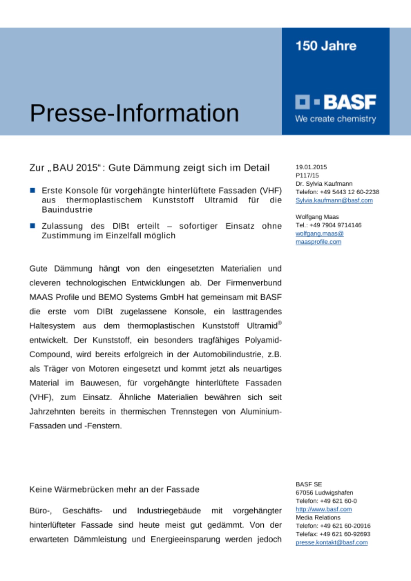 Auch das Brandverhalten wurde intensiv untersucht: Brandversuche mit komplett montierten Fassaden haben gezeigt, dass auch bei starken Bränden die Fassade sicher befestigt bleibt und die thermoplastischen Konsolen nicht zur Weiterleitung des Brandes beitragen. Mit ihrer Expertise bei Technischen Kunststoffen konnte BASF die Firma MAAS-BEMO bei Materialauswahl, Produktentwicklung und Zulassung unterstützen. Dr. Kay Brockmüller, Projektleiter der BASF in der Anwendungsentwicklung für technische Kunststoffe im Baubereich, erläutert: “Der verstärkte Thermoplast-Werkstoff hat hervorragende Dämmeigenschaften, ist hochbelastbar, altert im Gegensatz zu verschiedenen anderen Kunststoffen praktisch nicht, ist UV beständig und sehr zäh.“ Für Bauherren und Architekten steht damit eine gute Alternative zu den herkömmlichen metallischen Befestigungen zur Verfügung um eine optimale Dämmung und Energieeinsparung zu garantieren.