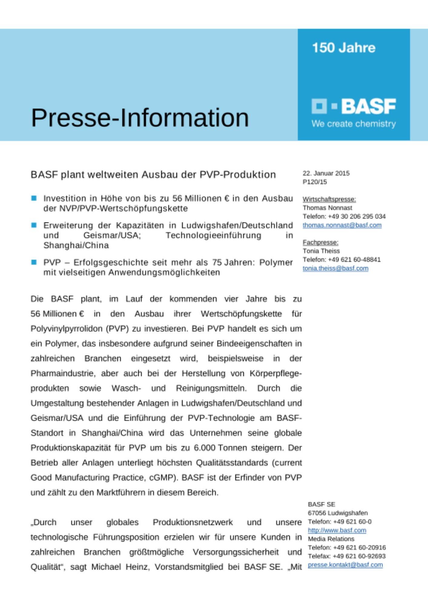 Die BASF plant, im Lauf der kommenden vier Jahre bis zu 56 Millionen € in den Ausbau ihrer Wertschöpfungskette für Polyvinylpyrrolidon (PVP) zu investieren. Bei PVP handelt es sich um ein Polymer, das insbesondere aufgrund seiner Bindeeigenschaften in zahlreichen Branchen eingesetzt wird, beispielsweise in der Pharmaindustrie, aber auch bei der Herstellung von Körperpflege-produkten sowie Wasch- und Reinigungsmitteln. Durch die Umgestaltung bestehender Anlagen in Ludwigshafen/Deutschland und Geismar/USA und die Einführung der PVP-Technologie am BASF-Standort in Shanghai/China wird das Unternehmen seine globale Produktionskapazität für PVP um bis zu 6.000 Tonnen steigern. Der Betrieb aller Anlagen unterliegt höchsten Qualitätsstandards (current Good Manufacturing Practice, cGMP). BASF ist der Erfinder von PVP und zählt zu den Marktführern in diesem Bereich.