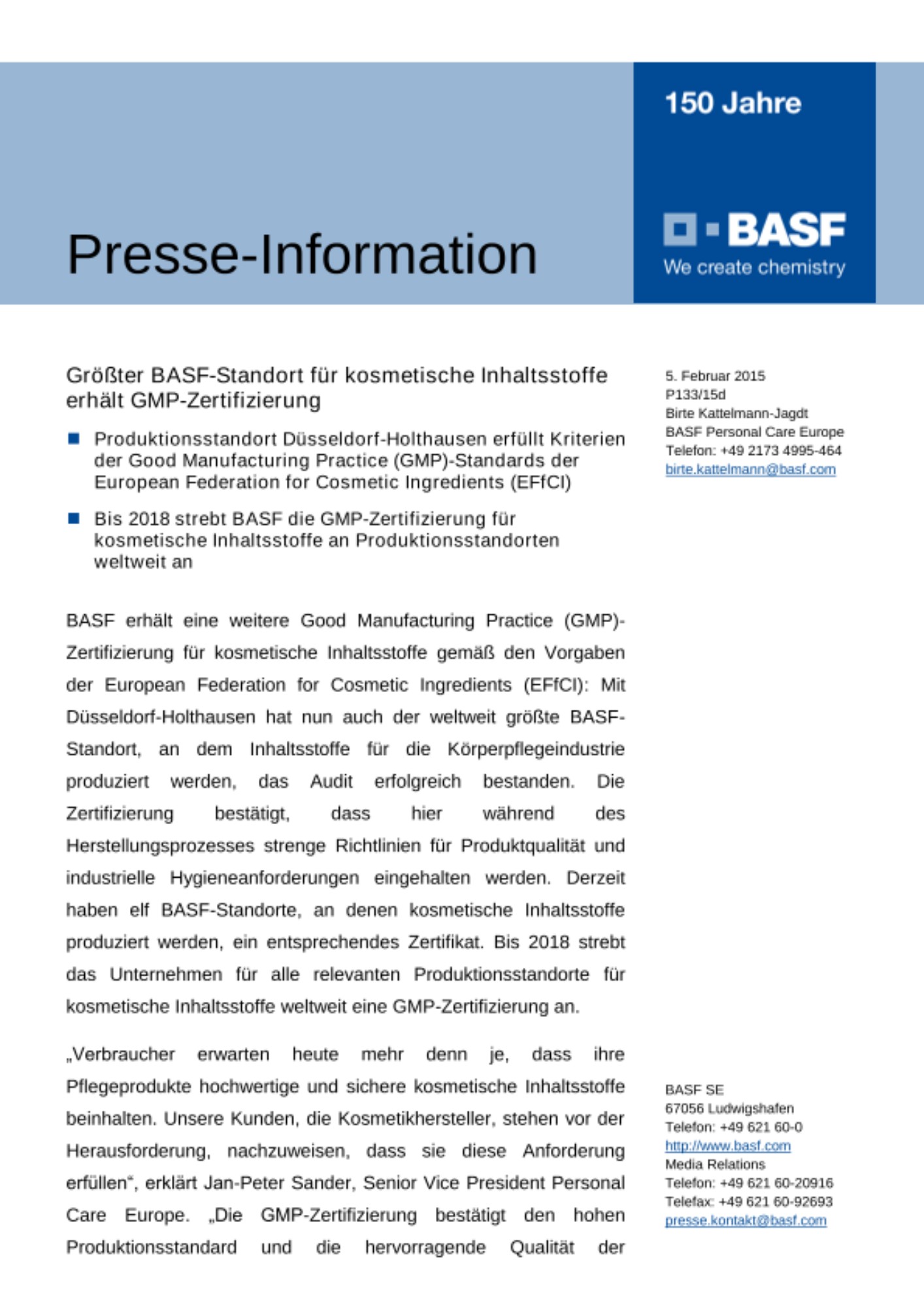 - Bis 2018 strebt BASF die GMP-Zertifizierung für kosmetische Inhaltsstoffe an Produktionsstandorten weltweit an