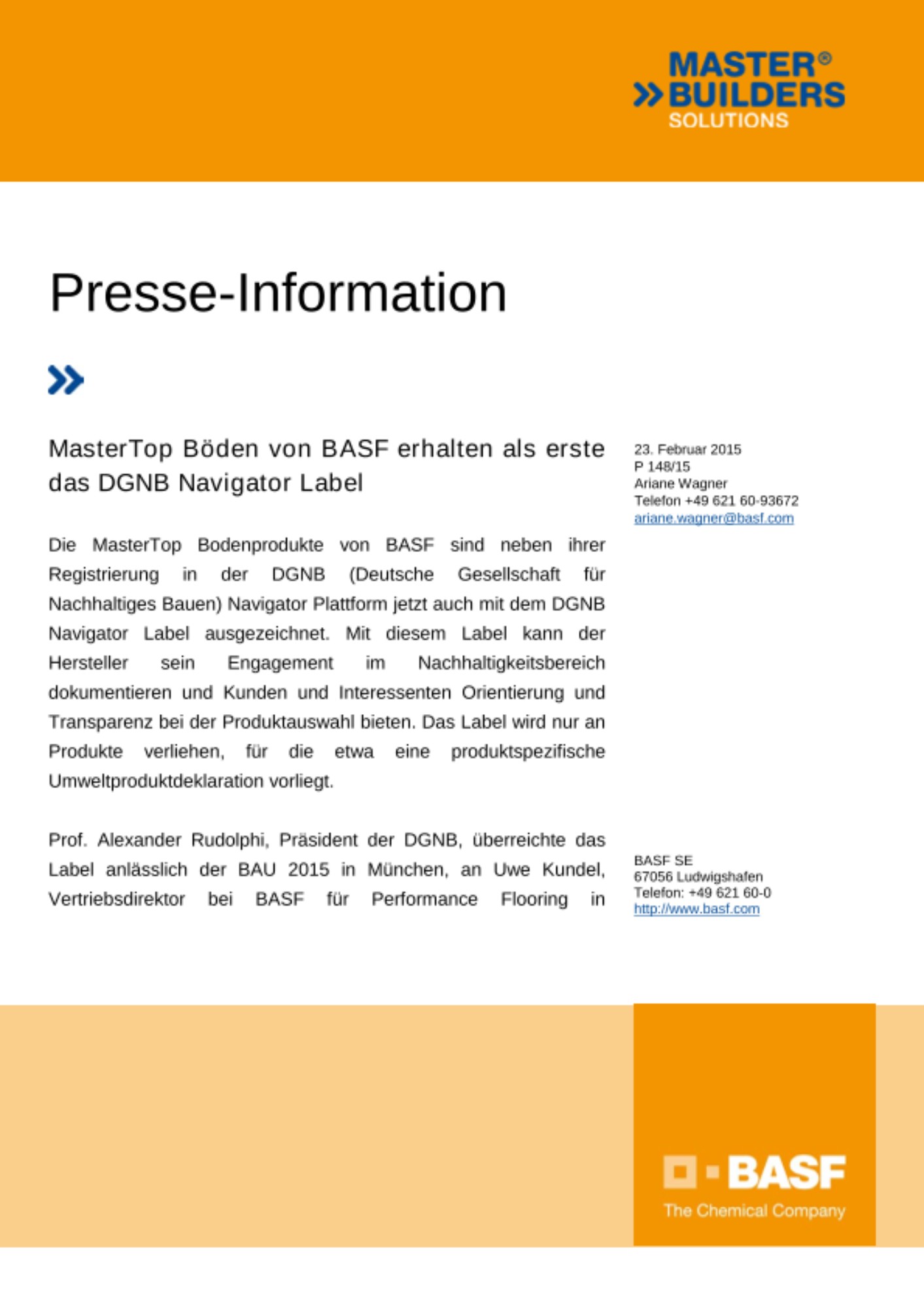 Prof. Alexander Rudolphi, Präsident der DGNB, überreichte das Label anlässlich der BAU 2015 in München, an Uwe Kundel, Vertriebsdirektor bei BASF für Performance Flooring in Deutschland, Österreich und der Schweiz. „Wir sind sehr stolz darauf, als erster Hersteller von fugenlosen Polyurethan- und Epoxidharz-Bodensystemen das DGNB Navigator Label zu erhalten. Dies spiegelt unseren fortwährenden Einsatz wieder, umweltfreundliche Bodenprodukte zu entwickeln, unsere Kunden beim nachhaltigen Bauen zu unterstützen und ihnen diesbezüglich Transparenz und Informationen zu bieten“, sagt Uwe Kundel.