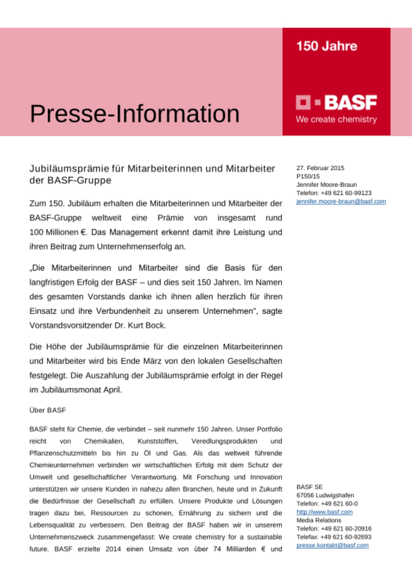 „Die Mitarbeiterinnen und Mitarbeiter sind die Basis für den langfristigen Erfolg der BASF – und dies seit 150 Jahren. Im Namen des gesamten Vorstands danke ich ihnen allen herzlich für ihren Einsatz und ihre Verbundenheit zu unserem Unternehmen“, sagte Vorstandsvorsitzender Dr. Kurt Bock.