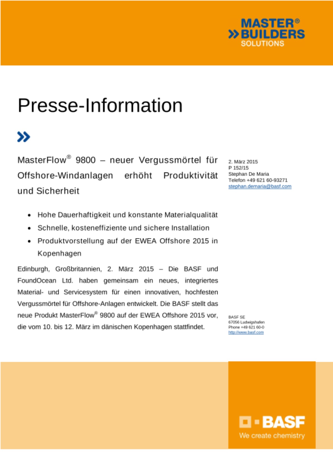 Edinburgh, Großbritannien, 2. März 2015 – Die BASF und FoundOcean Ltd. haben gemeinsam ein neues, integriertes Material- und Servicesystem für einen innovativen, hochfesten Vergussmörtel für Offshore-Anlagen entwickelt. Die BASF stellt das neue Produkt MasterFlow® 9800 auf der EWEA Offshore 2015 vor, die vom 10. bis 12. März im dänischen Kopenhagen stattfindet.