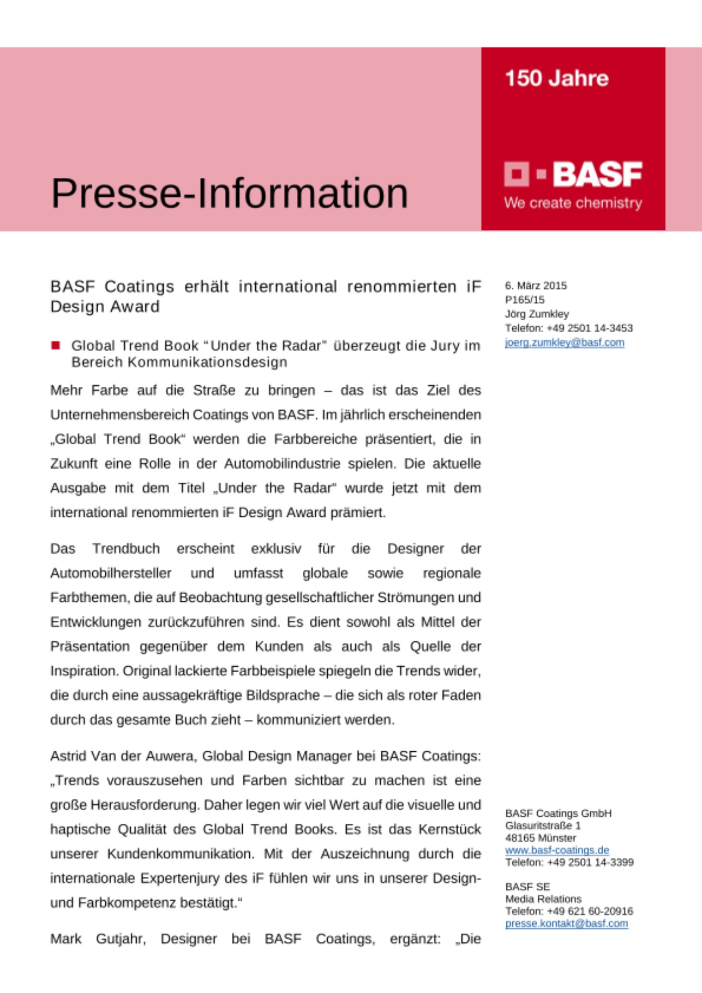 Mark Gutjahr, Designer bei BASF Coatings, ergänzt: „Die Auszeichnung von ‚Under the Radar‘ zeigt, dass wir sowohl unsere Kunden als auch eine Designjury überzeugen und Farbtrends auf innovative Weise vermitteln können“. Bereits seit Oktober zählt das Buch zu den Preisträgern des „Red Dot Award: Communication Design“. Mit dem Gewinn des iF Design Awards ist BASF erneut bei den beiden international renommiertesten Designwettbewerben erfolgreich vertreten.