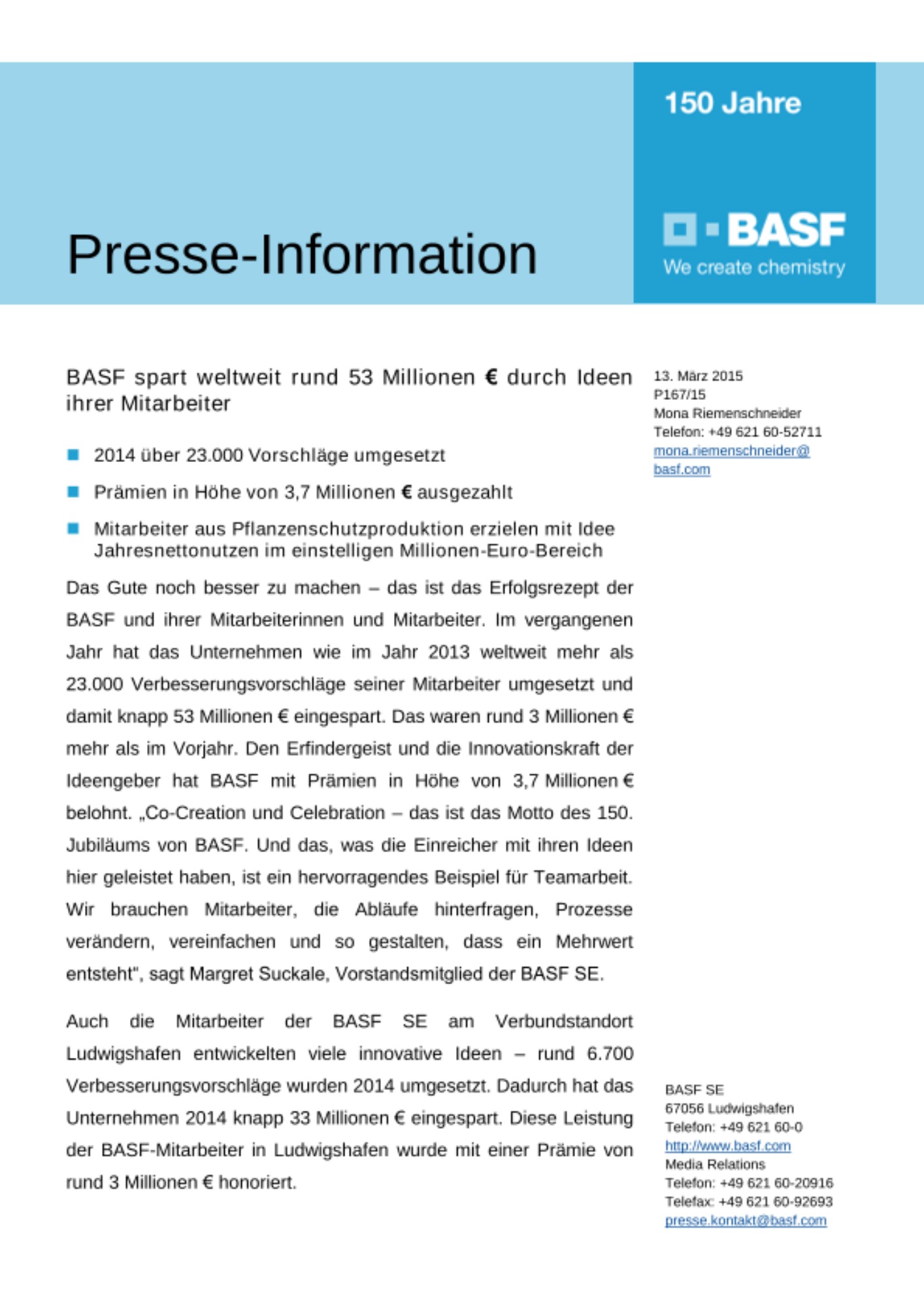 Das Gute noch besser zu machen – das ist das Erfolgsrezept der BASF und ihrer Mitarbeiterinnen und Mitarbeiter. Im vergangenen Jahr hat das Unternehmen wie im Jahr 2013 weltweit mehr als 23.000 Verbesserungsvorschläge seiner Mitarbeiter umgesetzt und damit knapp 53 Millionen € eingespart. Das waren rund 3 Millionen € mehr als im Vorjahr. Den Erfindergeist und die Innovationskraft der Ideengeber hat BASF mit Prämien in Höhe von 3,7 Millionen € belohnt. „Co-Creation und Celebration – das ist das Motto des 150. Jubiläums von BASF. Und das, was die Einreicher mit ihren Ideen hier geleistet haben, ist ein hervorragendes Beispiel für Teamarbeit. Wir brauchen Mitarbeiter, die Abläufe hinterfragen, Prozesse verändern, vereinfachen und so gestalten, dass ein Mehrwert entsteht“, sagt Margret Suckale, Vorstandsmitglied der BASF SE.