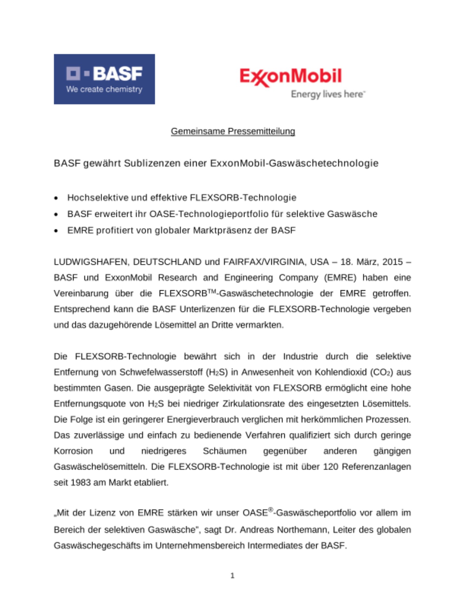LUDWIGSHAFEN, DEUTSCHLAND und FAIRFAX/VIRGINIA, USA – 18. März, 2015 – BASF und ExxonMobil Research and Engineering Company (EMRE) haben eine Vereinbarung über die FLEXSORBTM-Gaswäschetechnologie der EMRE getroffen. Entsprechend kann die BASF Unterlizenzen für die FLEXSORB-Technologie vergeben und das dazugehörende Lösemittel an Dritte vermarkten.
