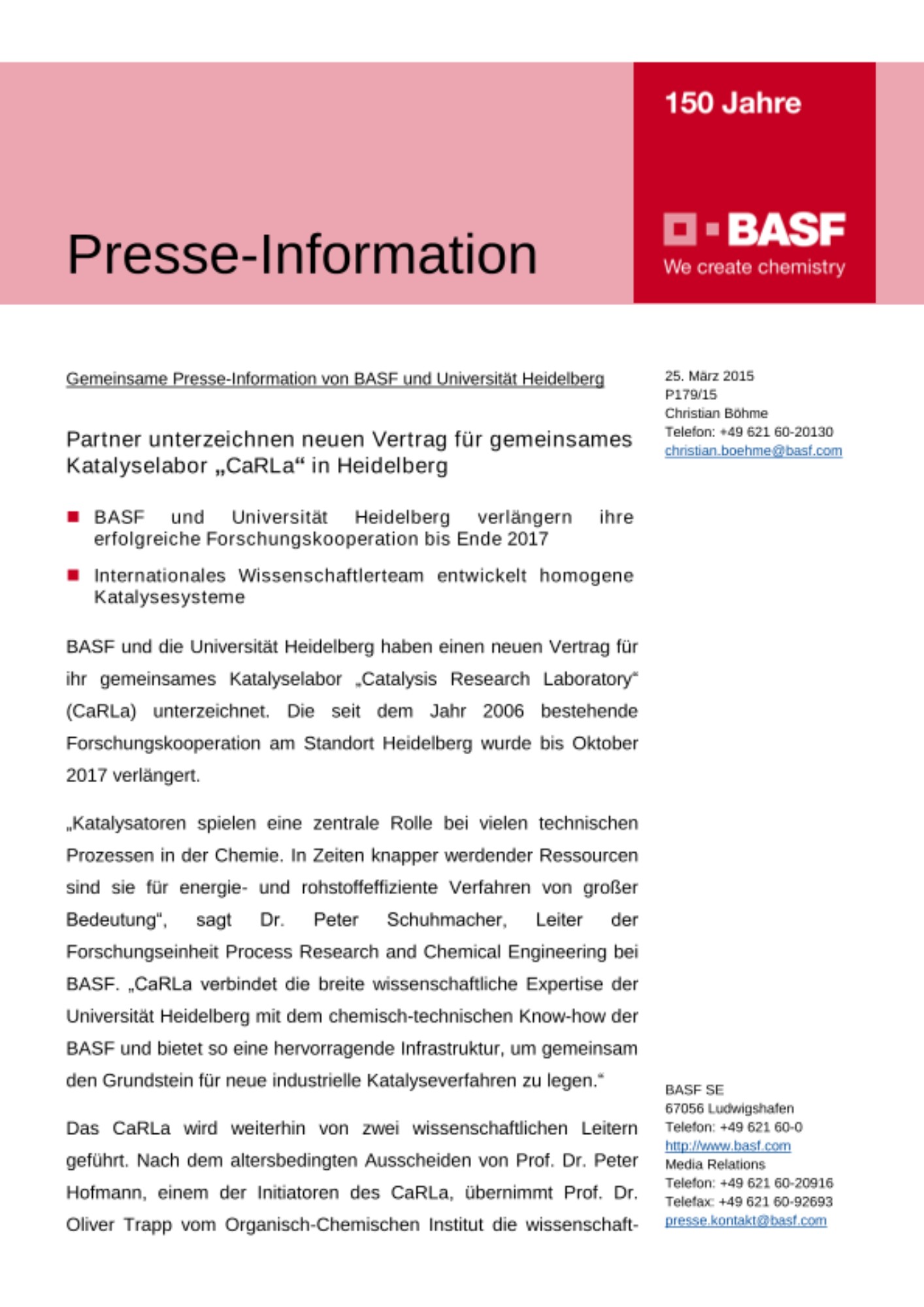 BASF und die Universität Heidelberg haben einen neuen Vertrag für ihr gemeinsames Katalyselabor „Catalysis Research Laboratory“ (CaRLa) unterzeichnet. Die seit dem Jahr 2006 bestehende Forschungskooperation am Standort Heidelberg wurde bis Oktober 2017 verlängert.