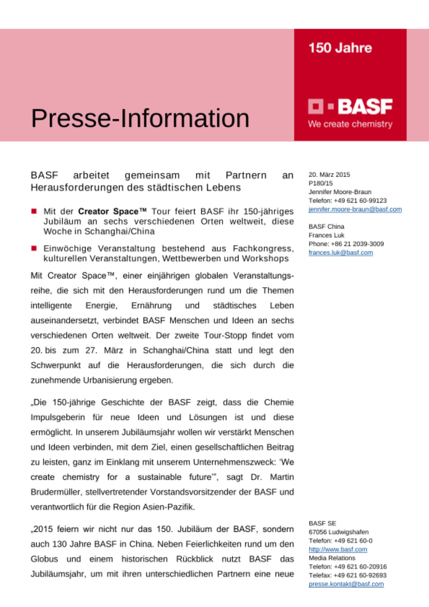 Mit Creator Space™, einer einjährigen globalen Veranstaltungsreihe, die sich mit den Herausforderungen rund um die Themen intelligente Energie, Ernährung und städtisches Leben auseinandersetzt, verbindet BASF Menschen und Ideen an sechs verschiedenen Orten weltweit. Der zweite Tour-Stopp findet vom 20. bis zum 27. März in Schanghai/China statt und legt den Schwerpunkt auf die Herausforderungen, die sich durch die zunehmende Urbanisierung ergeben.