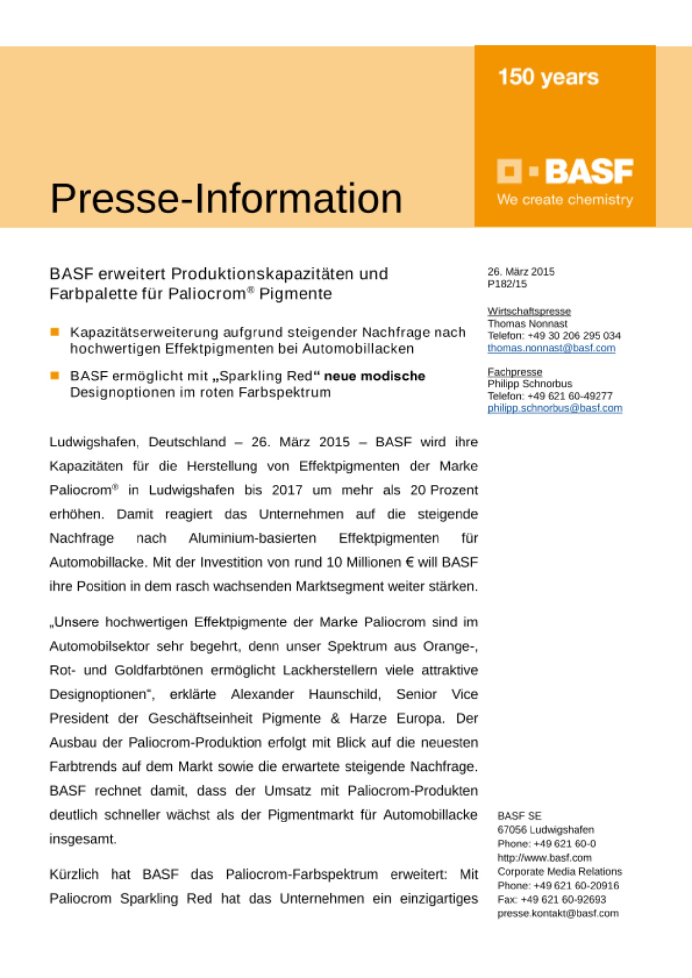 „Unsere hochwertigen Effektpigmente der Marke Paliocrom sind im Automobilsektor sehr begehrt, denn unser Spektrum aus Orange-, Rot- und Goldfarbtönen ermöglicht Lackherstellern viele attraktive Designoptionen“, erklärte Alexander Haunschild, Senior Vice President der Geschäftseinheit Pigmente & Harze Europa. Der Ausbau der Paliocrom-Produktion erfolgt mit Blick auf die neuesten Farbtrends auf dem Markt sowie die erwartete steigende Nachfrage. BASF rechnet damit, dass der Umsatz mit Paliocrom-Produkten deutlich schneller wächst als der Pigmentmarkt für Automobillacke insgesamt.