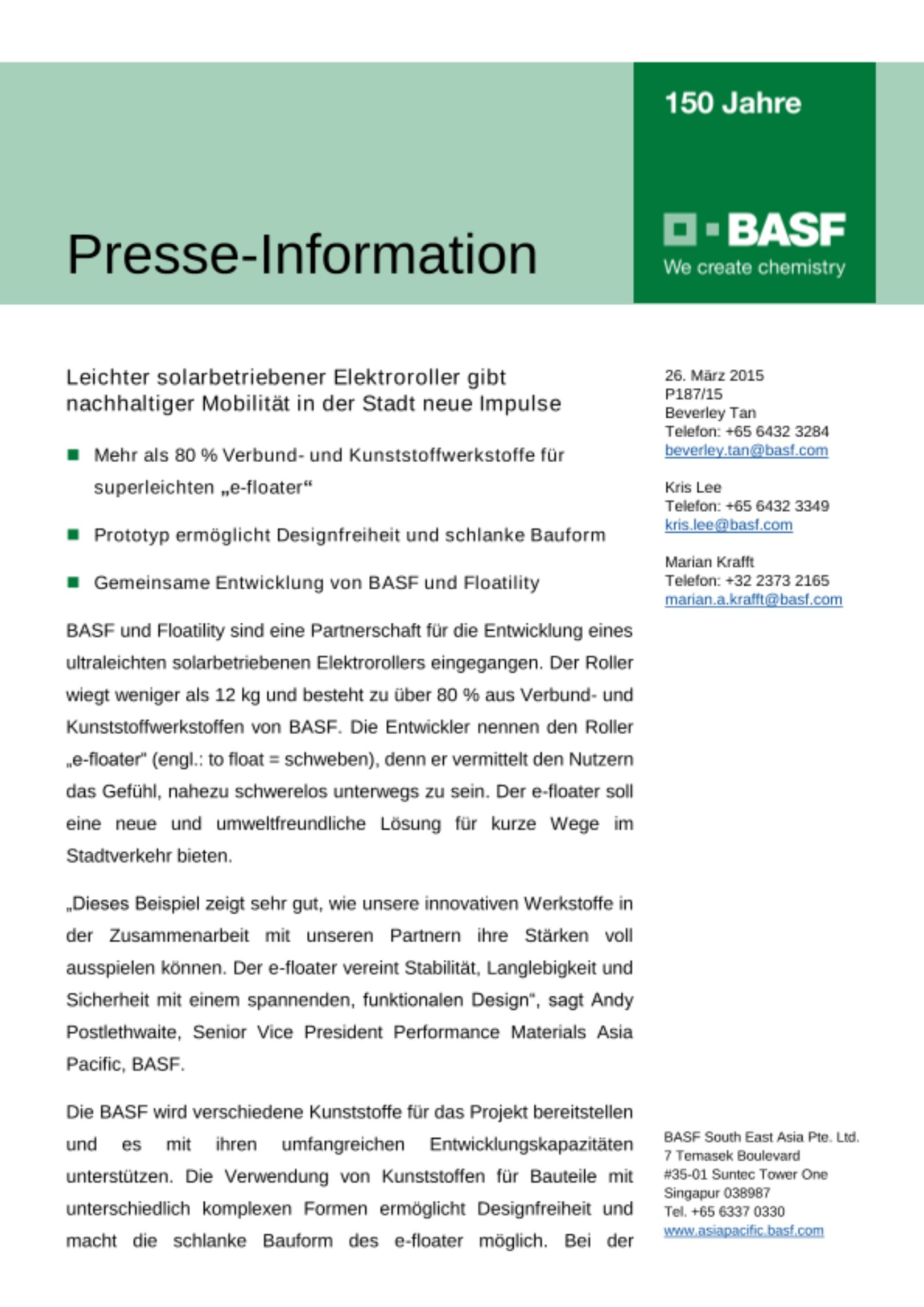 BASF und Floatility sind eine Partnerschaft für die Entwicklung eines ultraleichten solarbetriebenen Elektrorollers eingegangen. Der Roller wiegt weniger als 12 kg und besteht zu über 80 % aus Verbund- und Kunststoffwerkstoffen von BASF. Die Entwickler nennen den Roller „e-floater“ (engl.: to float = schweben), denn er vermittelt den Nutzern das Gefühl, nahezu schwerelos unterwegs zu sein. Der e-floater soll eine neue und umweltfreundliche Lösung für kurze Wege im Stadtverkehr bieten.