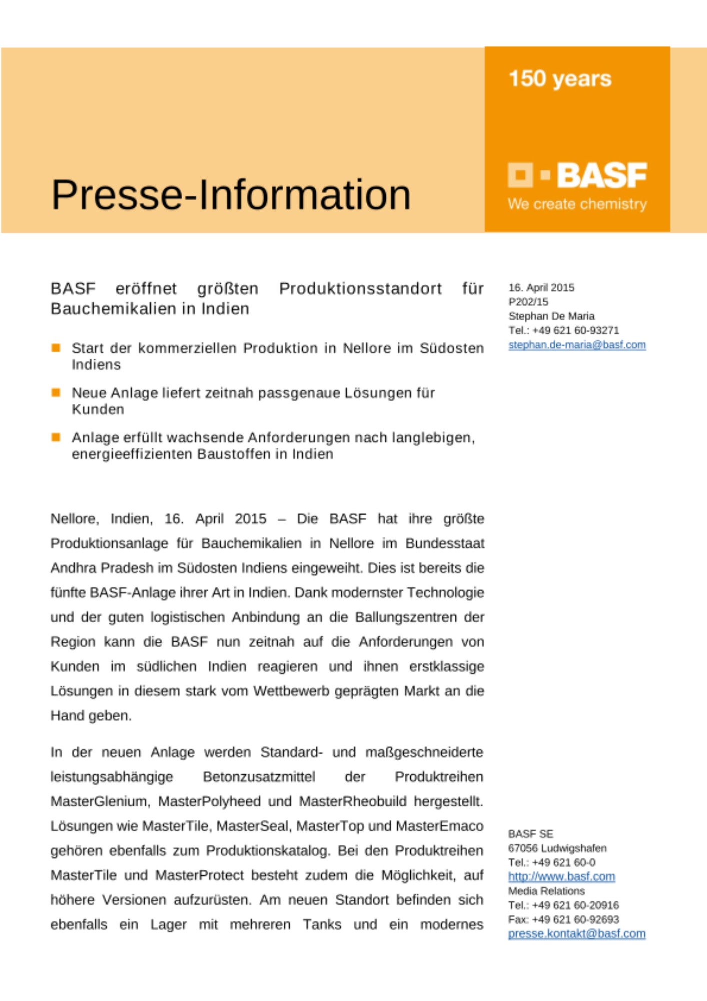 Nellore, Indien, 16. April 2015 – Die BASF hat ihre größte Produktionsanlage für Bauchemikalien in Nellore im Bundesstaat Andhra Pradesh im Südosten Indiens eingeweiht. Dies ist bereits die fünfte BASF-Anlage ihrer Art in Indien. Dank modernster Technologie und der guten logistischen Anbindung an die Ballungszentren der Region kann die BASF nun zeitnah auf die Anforderungen von Kunden im südlichen Indien reagieren und ihnen erstklassige Lösungen in diesem stark vom Wettbewerb geprägten Markt an die Hand geben.