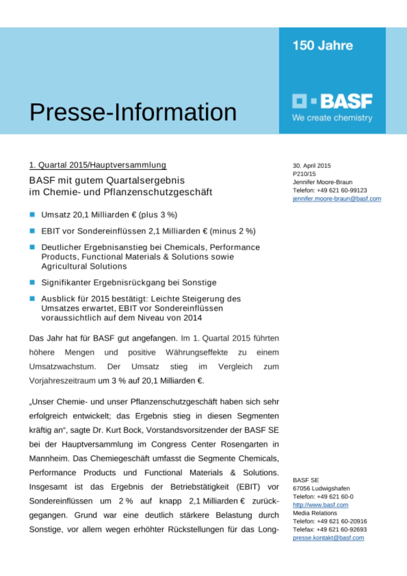 „Unser Chemie- und unser Pflanzenschutzgeschäft haben sich sehr erfolgreich entwickelt; das Ergebnis stieg in diesen Segmenten kräftig an“, sagte Dr. Kurt Bock, Vorstandsvorsitzender der BASF SE bei der Hauptversammlung im Congress Center Rosengarten in Mannheim. Das Chemiegeschäft umfasst die Segmente Chemicals, Performance Products und Functional Materials & Solutions. Insgesamt ist das Ergebnis der Betriebstätigkeit (EBIT) vor Sondereinflüssen um 2 % auf knapp 2,1 Milliarden € zurückgegangen. Grund war eine deutlich stärkere Belastung durch Sonstige, vor allem wegen erhöhter Rückstellungen für das Long-Term-Incentive(LTI)-Programm infolge der positiven Aktienkursentwicklung.