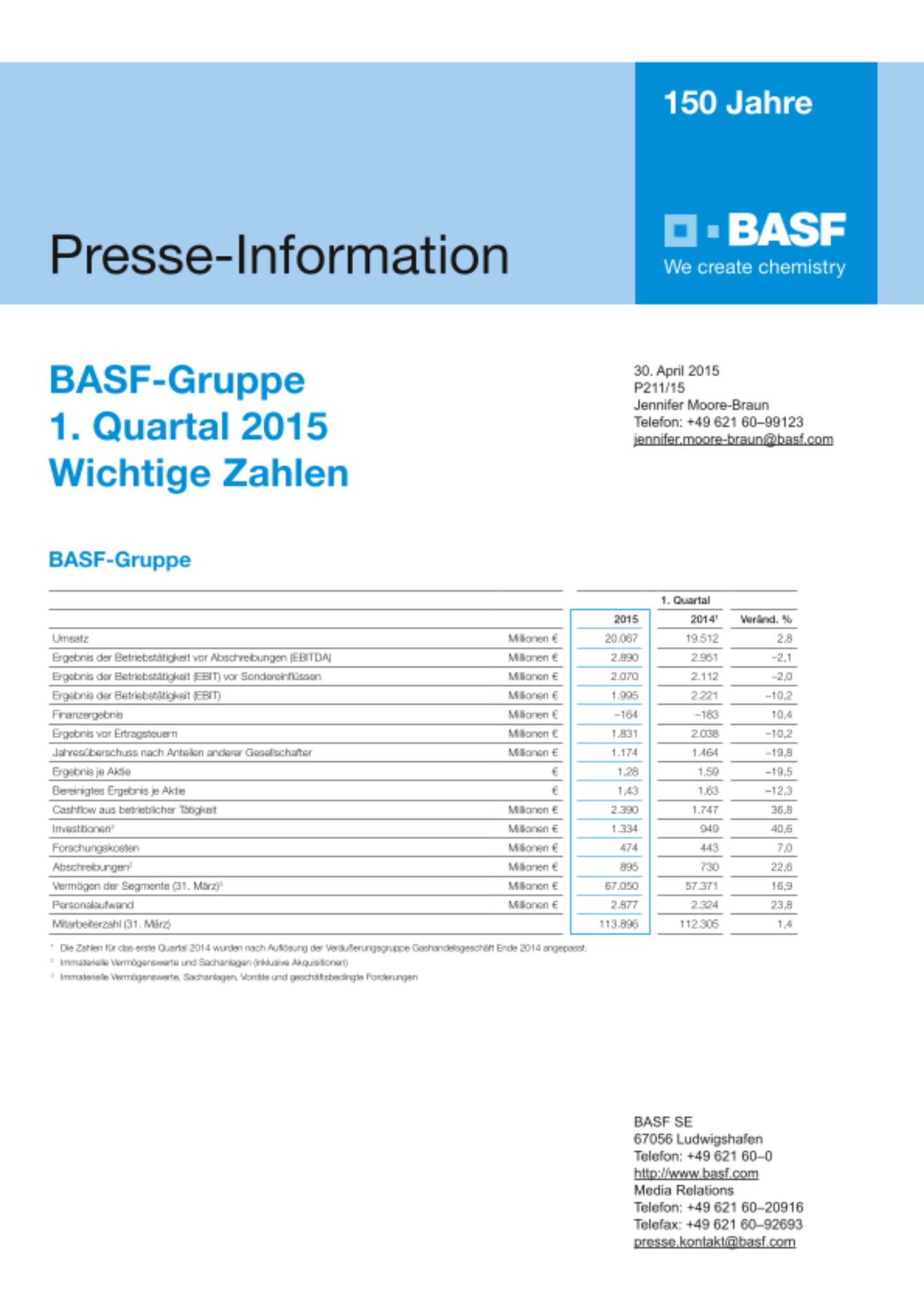 Das Jahr hat für BASF gut angefangen. Im 1. Quartal 2015 führten höhere Mengen und positive Währungseffekte zu einem Umsatzwachstum. Der Umsatz stieg im Vergleich zum Vorjahreszeitraum um 3 % auf 20,1 Milliarden €.