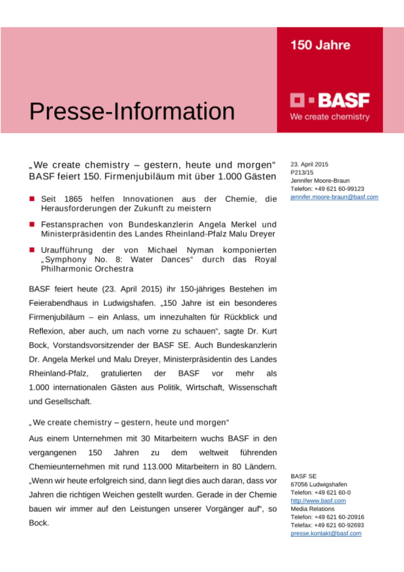 BASF feiert heute (23. April 2015) ihr 150-jähriges Bestehen im Feierabendhaus in Ludwigshafen. „150 Jahre ist ein besonderes Firmenjubiläum – ein Anlass, um innezuhalten für Rückblick und Reflexion, aber auch, um nach vorne zu schauen“, sagte Dr. Kurt Bock, Vorstandsvorsitzender der BASF SE. Auch Bundeskanzlerin Dr. Angela Merkel und Malu Dreyer, Ministerpräsidentin des Landes Rheinland-Pfalz, gratulierten der BASF vor mehr als 1.000 internationalen Gästen aus Politik, Wirtschaft, Wissenschaft und Gesellschaft.
