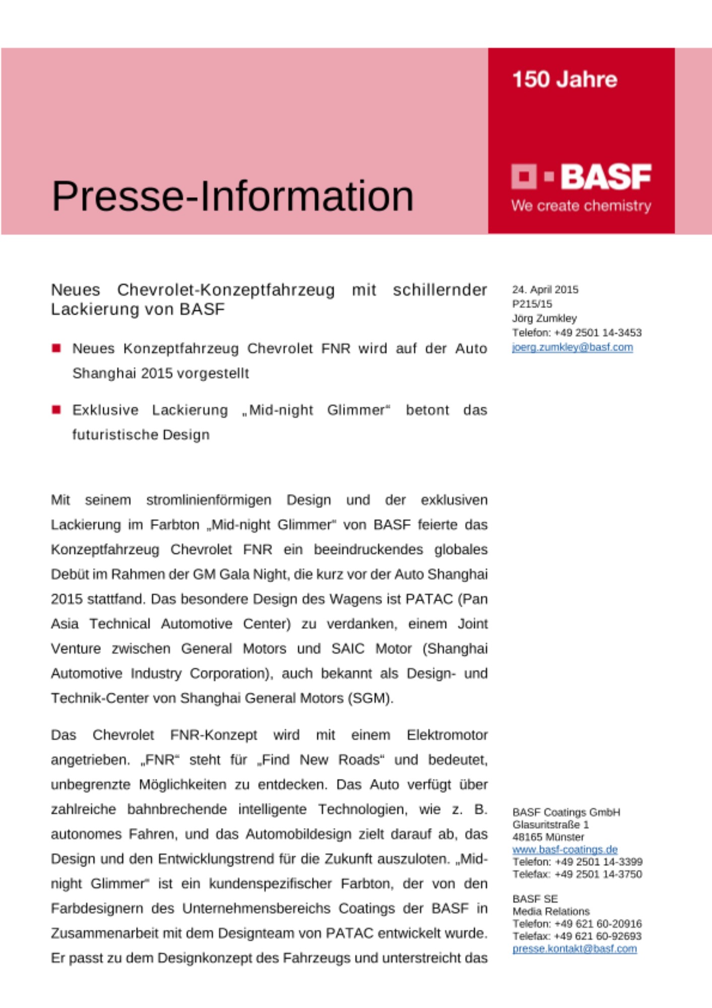 Dr. Thierry Herning, Geschäftsführer von BASF Shanghai Coatings, fügte hinzu: „Wir sind stolz, mit unseren innovativen Farbtönen und Lacken zu dem auffälligen Außendesign des Konzeptfahrzeugs Chevrolet FNR beigetragen zu haben. Das konnte nur durch die gemeinsamen Anstrengungen unseres globalen Coatings-Teams erreicht werden. Dies ist eine weitere Erfolgsgeschichte unserer ausgezeichneten Partnerschaft mit Shanghai General Motors und PATAC.“