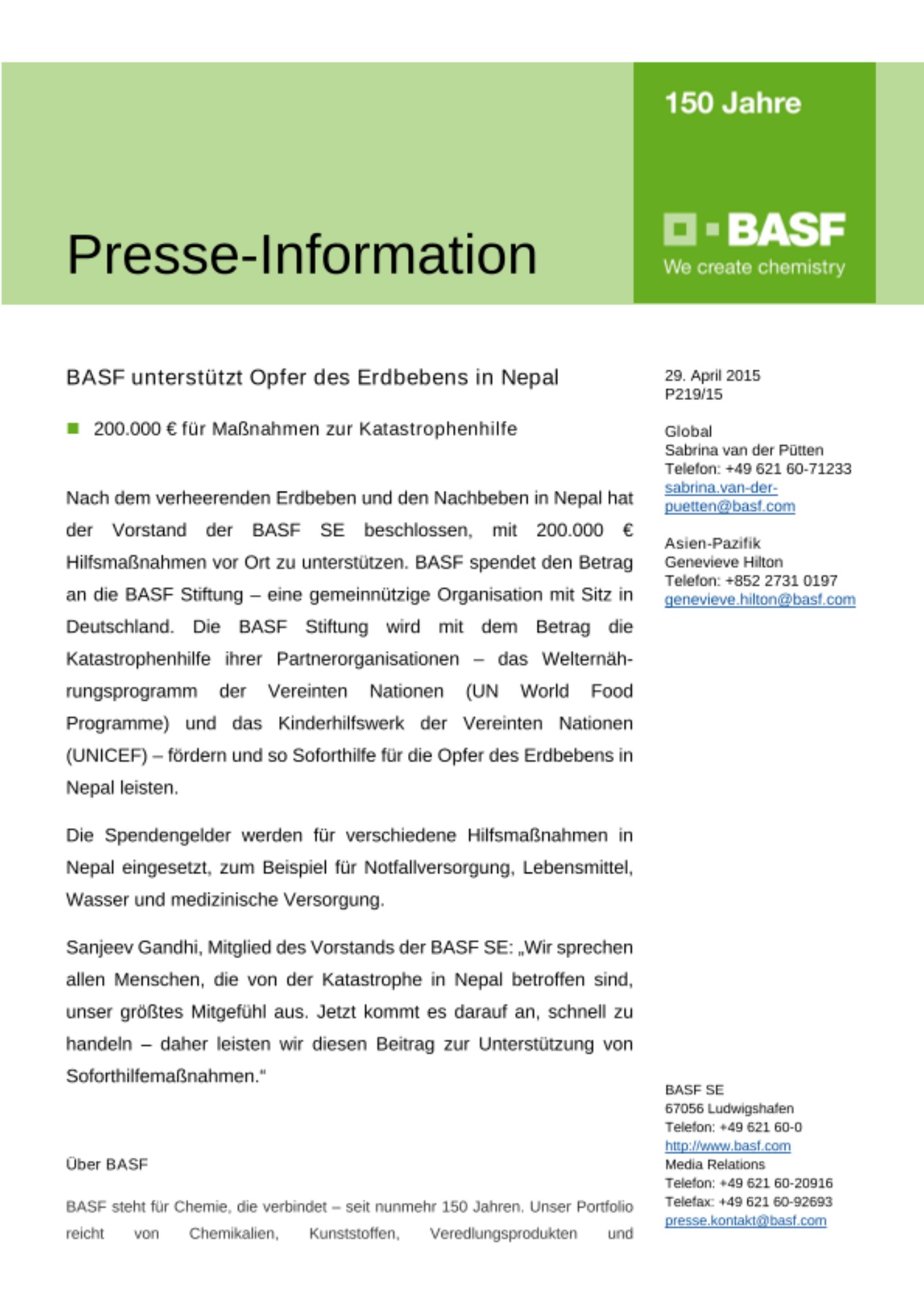 Nach dem verheerenden Erdbeben und den Nachbeben in Nepal hat der Vorstand der BASF SE beschlossen, mit 200.000 € Hilfsmaßnahmen vor Ort zu unterstützen. BASF spendet den Betrag an die BASF Stiftung – eine gemeinnützige Organisation mit Sitz in Deutschland. Die BASF Stiftung wird mit dem Betrag die Katastrophenhilfe ihrer Partnerorganisationen – das Welternährungsprogramm der Vereinten Nationen (UN World Food Programme) und das Kinderhilfswerk der Vereinten Nationen (UNICEF) – fördern und so Soforthilfe für die Opfer des Erdbebens in Nepal leisten.
