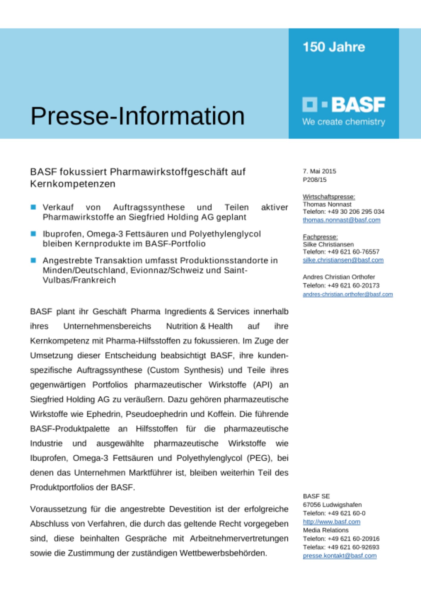 BASF plant ihr Geschäft Pharma Ingredients & Services innerhalb ihres Unternehmensbereichs Nutrition & Health auf ihre Kernkompetenz mit Pharma-Hilfsstoffen zu fokussieren. Im Zuge der Umsetzung dieser Entscheidung beabsichtigt BASF, ihre kundenspezifische Auftragssynthese (Custom Synthesis) und Teile ihres gegenwärtigen Portfolios pharmazeutischer Wirkstoffe (API) an Siegfried Holding AG zu veräußern. Dazu gehören pharmazeutische Wirkstoffe wie Ephedrin, Pseudoephedrin und Koffein. Die führende BASF-Produktpalette an Hilfsstoffen für die pharmazeutische Industrie und ausgewählte pharmazeutische Wirkstoffe wie Ibuprofen, Omega-3 Fettsäuren und Polyethylenglycol (PEG), bei denen das Unternehmen Marktführer ist, bleiben weiterhin Teil des Produktportfolios der BASF.