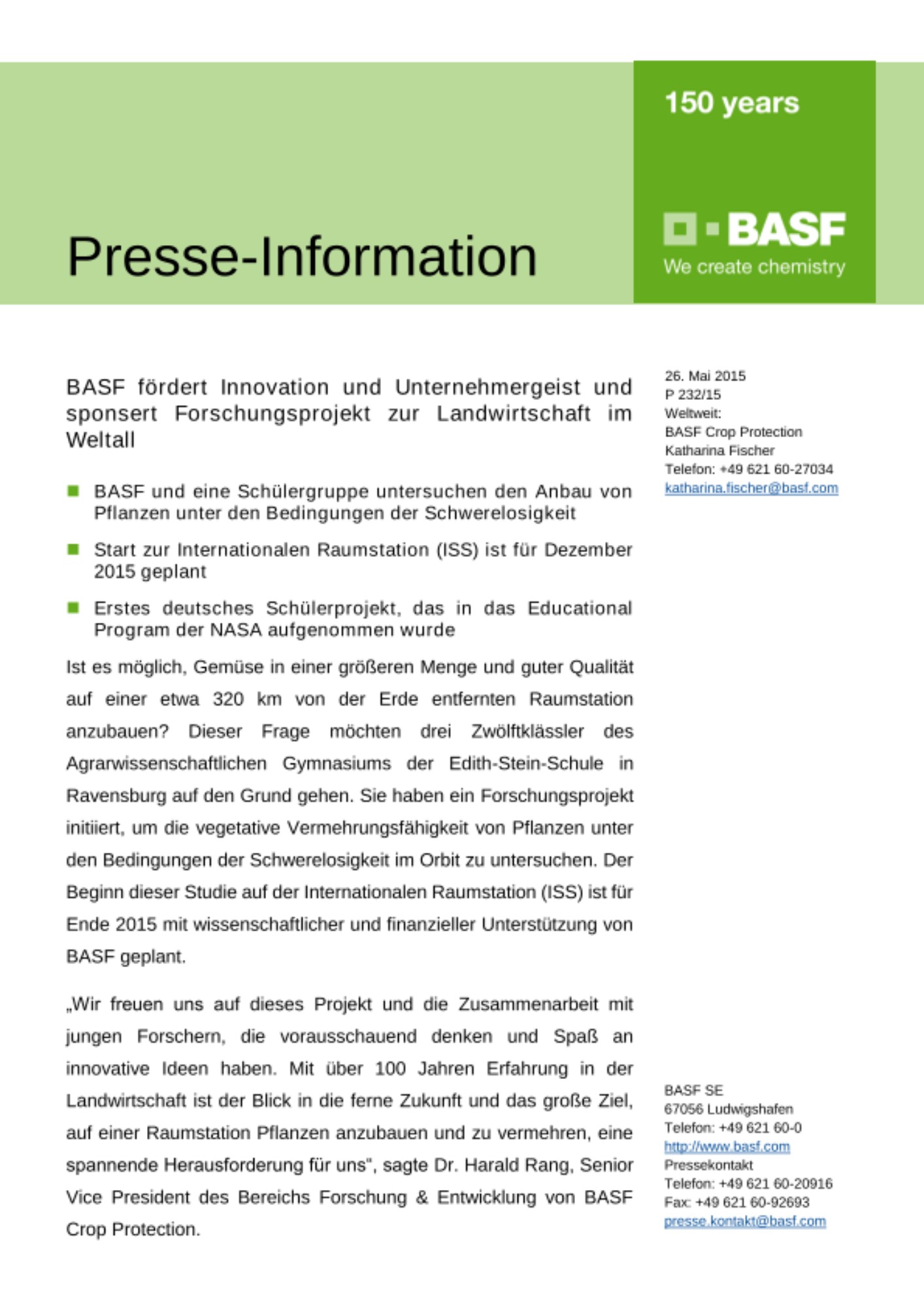 „Wir freuen uns auf dieses Projekt und die Zusammenarbeit mit jungen Forschern, die vorausschauend denken und Spaß an innovative Ideen haben. Mit über 100 Jahren Erfahrung in der Landwirtschaft ist der Blick in die ferne Zukunft und das große Ziel, auf einer Raumstation Pflanzen anzubauen und zu vermehren, eine spannende Herausforderung für uns“, sagte Dr. Harald Rang, Senior Vice President des Bereichs Forschung & Entwicklung von BASF Crop Protection.