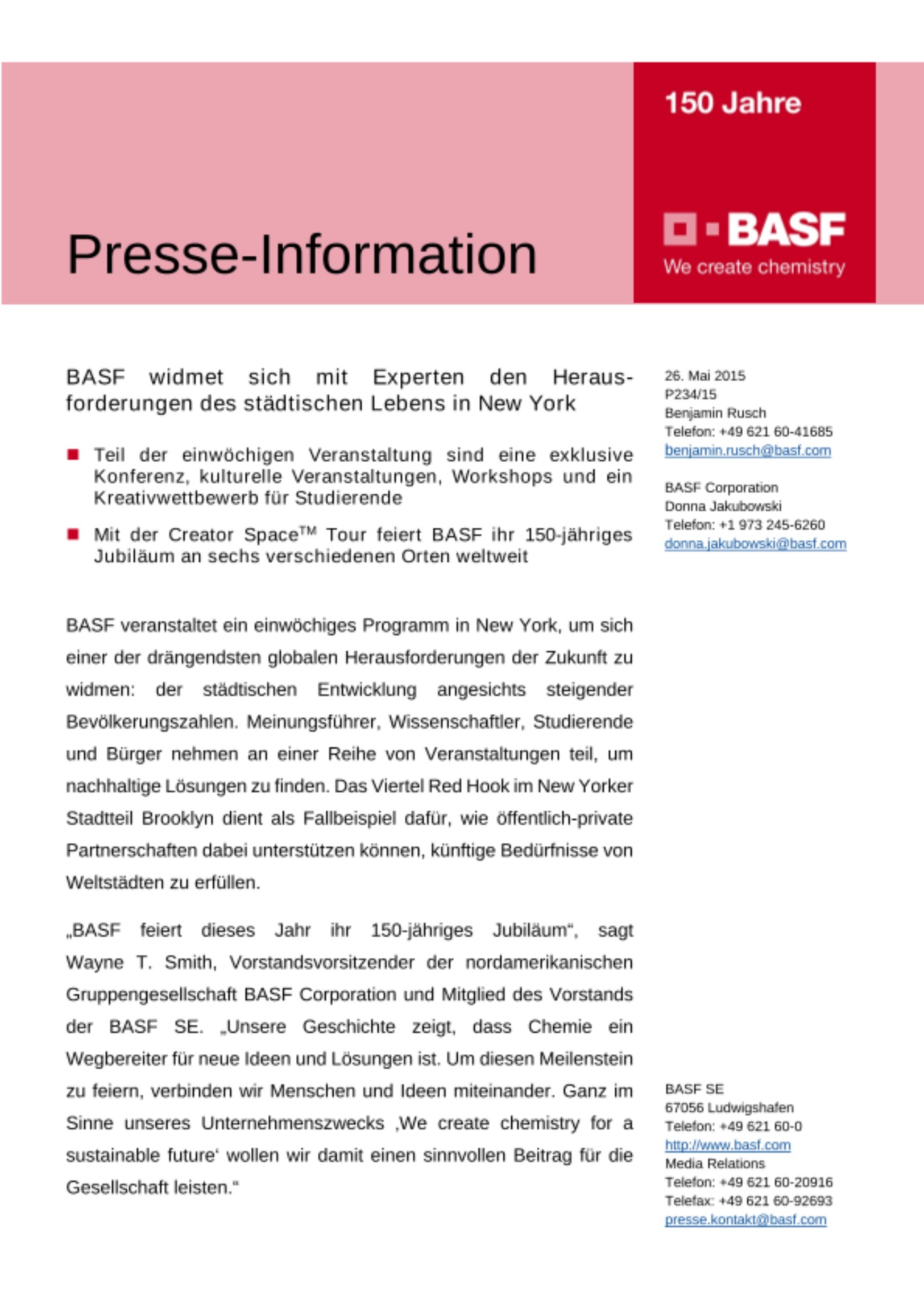 Im Verlauf ihres Jubiläumsjahres arbeitet BASF mit verschiedenen Stakeholdern in einem sogenannten Co-Creation-Programm zusammen. Der Fokus des Programms liegt auf den Themen intelligente Energie, Ernährung und städtisches Leben. Eckpfeiler der Jubiläumsfeierlichkeiten anlässlich des 150-jährigen Bestehens von BASF ist die Creator SpaceTM Tour – eine Reihe von einwöchigen Veranstaltungen in sechs Städten: Mumbai/Indien, Schanghai/China, São Paulo/Brasilien, Barcelona/Spanien, New York/USA und in Ludwigshafen, der Heimatstadt von BASF. Weitere zentrale Elemente, um innovative Lösungen voranzutreiben, sind Creator Space online – eine globale Internetplattform zur Zusammenarbeit – und drei Science Symposien in Ludwigshafen (Intelligente Energie), Chicago (Ernährung) und Schanghai (Städtisches Leben).