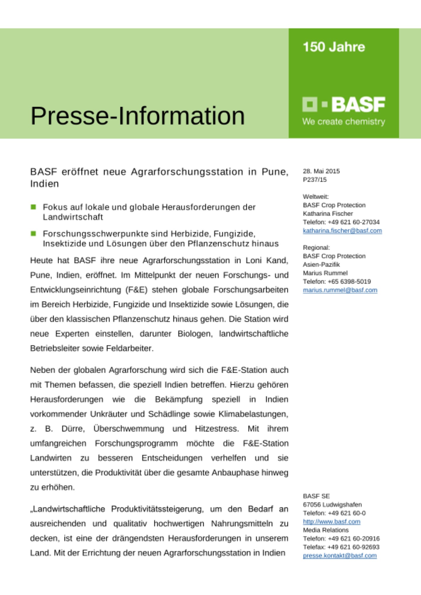 Die Station wird maßgeschneiderte Lösungen für Indiens Landwirtschaft entwickeln und gleichzeitig das strategische Ziel von BASF erfüllen: innovative Lösungen aus der Region Asien-Pazifik, für die Region Asien-Pazifik und für die ganze Welt. „Wir verstehen unsere Rolle als Partner für die Landwirte. Wir möchten mit ihnen arbeiten, um das Land, das sie für zukünftige Generationen bewahren, zu schützen und dabei gleichzeitig die wachsenden Bedürfnisse der Gesellschaft zu erfüllen. Das Team in Indien wird mit der Entwicklung neuer Wirkstoffe, Formulierungen und Technologien zu diesen Zielen beitragen“, sagte Markus Heldt, Leiter des BASF-Unternehmensbereichs Crop Protection.