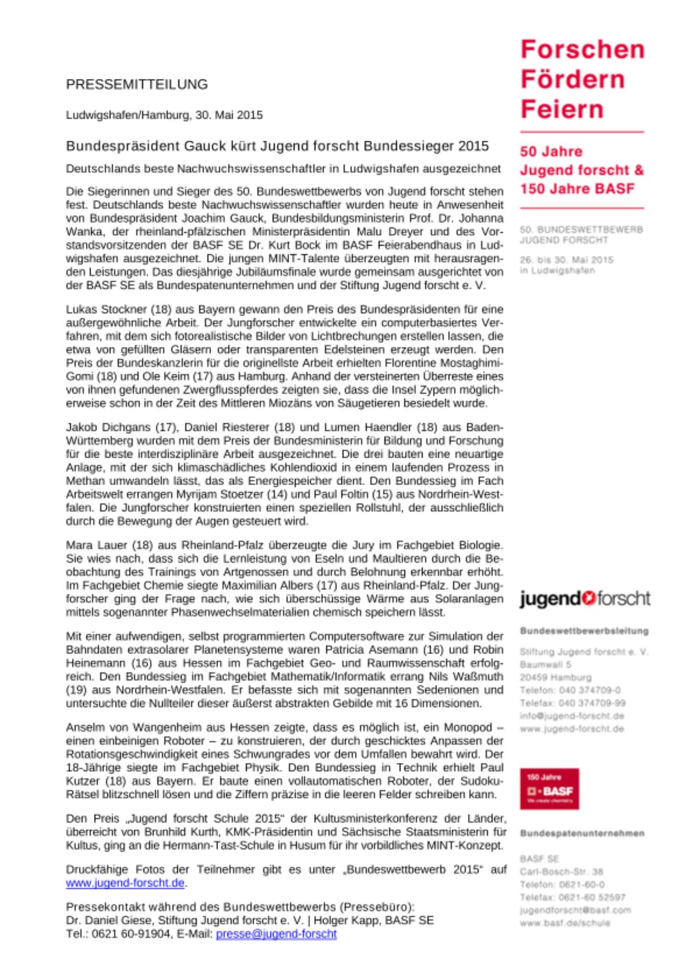Die Siegerinnen und Sieger des 50. Bundeswettbewerbs von Jugend forscht stehen fest. Deutschlands beste Nachwuchswissenschaftler wurden heute in Anwesenheit von Bundespräsident Joachim Gauck, Bundesbildungsministerin Prof. Dr. Johanna Wanka, der rheinland-pfälzischen Ministerpräsidentin Malu Dreyer und des Vorstandsvorsitzenden der BASF SE Dr. Kurt Bock im BASF Feierabendhaus in Ludwigshafen ausgezeichnet. Die jungen MINT-Talente überzeugten mit herausragenden Leistungen. Das diesjährige Jubiläumsfinale wurde gemeinsam ausgerichtet von der BASF SE als Bundespatenunternehmen und der Stiftung Jugend forscht e. V.