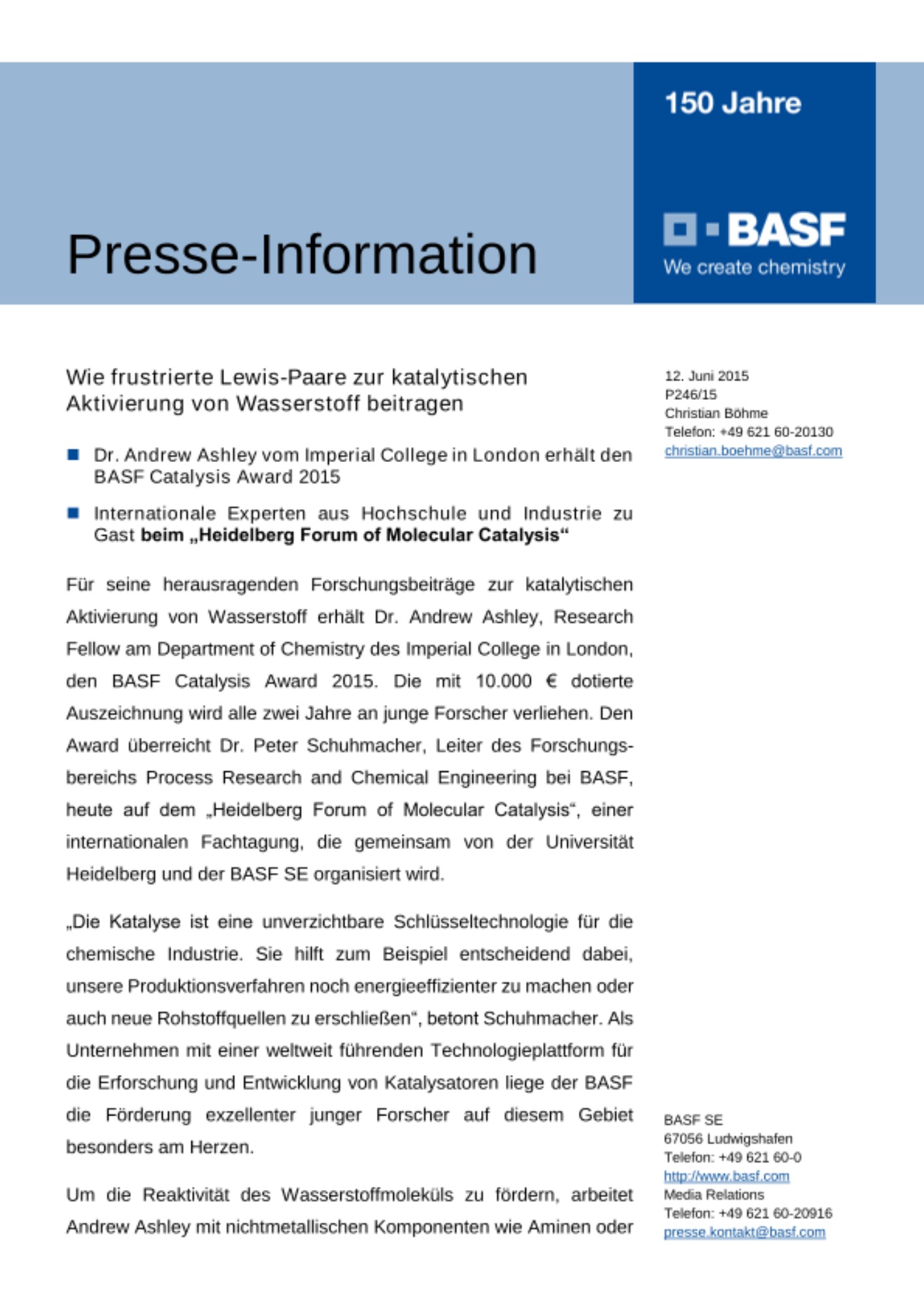 Für seine herausragenden Forschungsbeiträge zur katalytischen Aktivierung von Wasserstoff erhält Dr. Andrew Ashley, Research Fellow am Department of Chemistry des Imperial College in London, den BASF Catalysis Award 2015. Die mit 10.000 € dotierte Auszeichnung wird alle zwei Jahre an junge Forscher verliehen. Den Award überreicht Dr. Peter Schuhmacher, Leiter des Forschungs-bereichs Process Research and Chemical Engineering bei BASF, heute auf dem „Heidelberg Forum of Molecular Catalysis“, einer internationalen Fachtagung, die gemeinsam von der Universität Heidelberg und der BASF SE organisiert wird.