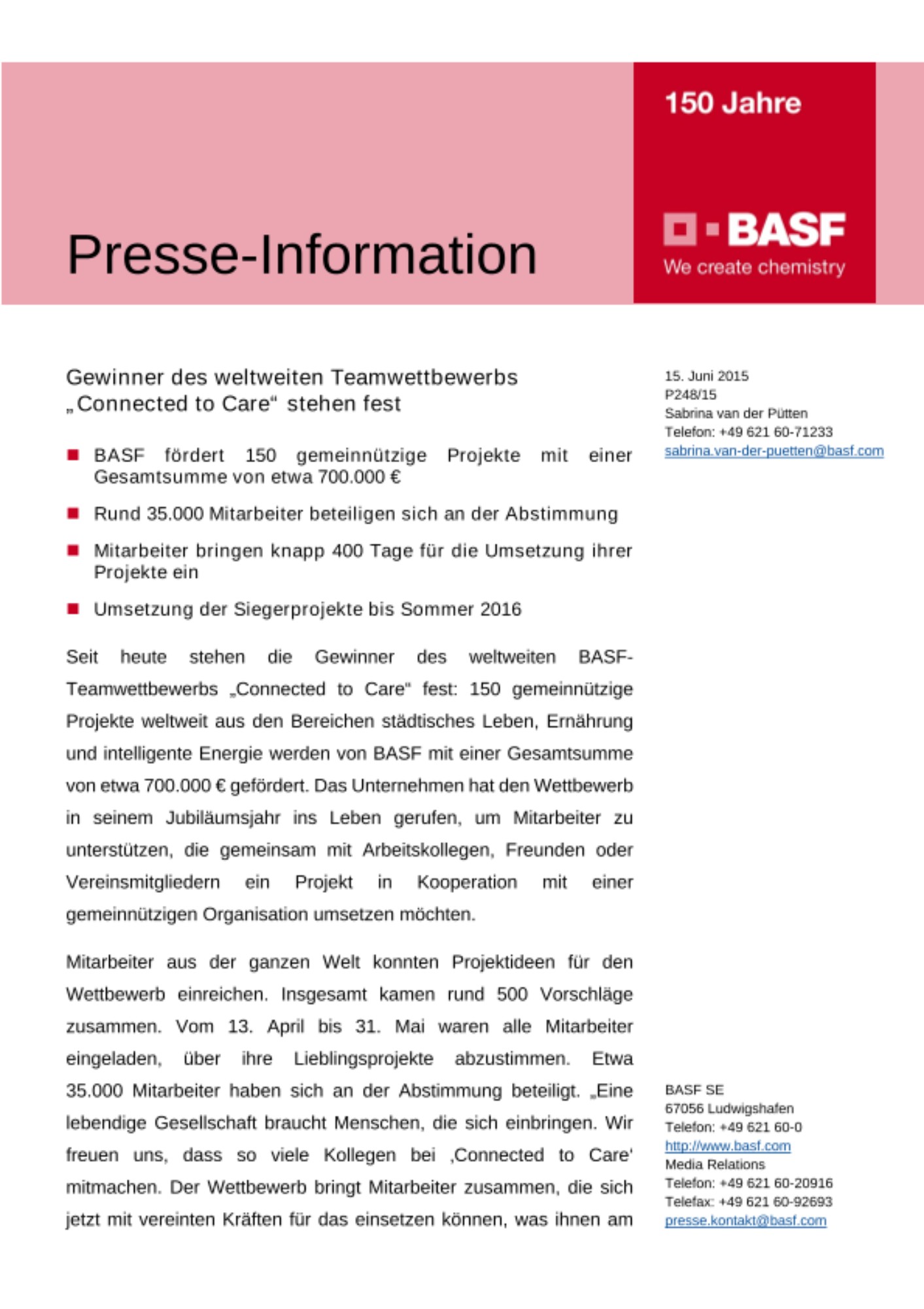 Seit heute stehen die Gewinner des weltweiten BASF-Teamwettbewerbs „Connected to Care“ fest: 150 gemeinnützige Projekte weltweit aus den Bereichen städtisches Leben, Ernährung und intelligente Energie werden von BASF mit einer Gesamtsumme von etwa 700.000 € gefördert. Das Unternehmen hat den Wettbewerb in seinem Jubiläumsjahr ins Leben gerufen, um Mitarbeiter zu unterstützen, die gemeinsam mit Arbeitskollegen, Freunden oder Vereinsmitgliedern ein Projekt in Kooperation mit einer gemeinnützigen Organisation umsetzen möchten.