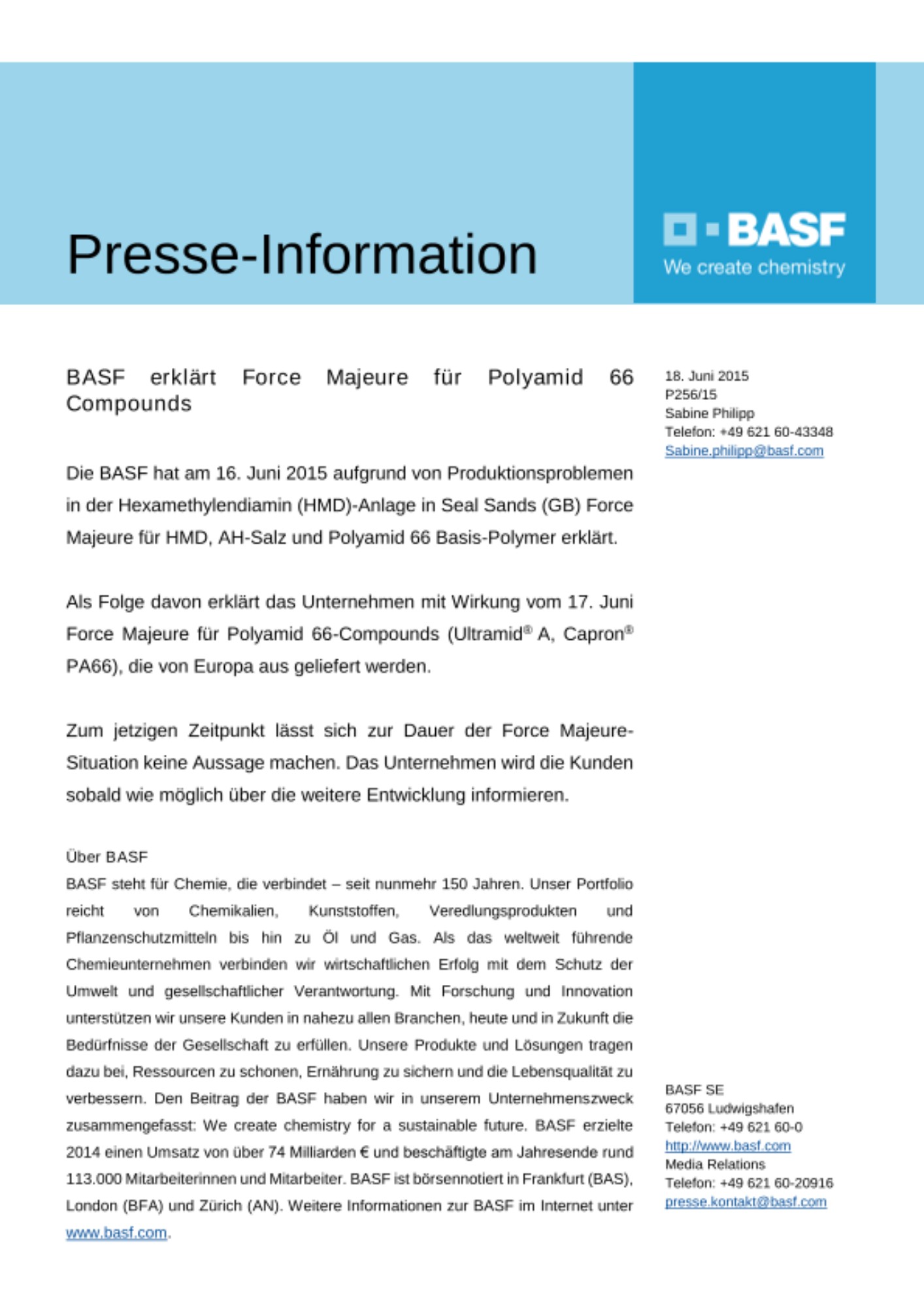 Die BASF hat am 16. Juni 2015 aufgrund von Produktionsproblemen in der Hexamethylendiamin (HMD)-Anlage in Seal Sands (GB) Force Majeure für HMD, AH-Salz und Polyamid 66 Basis-Polymer erklärt.