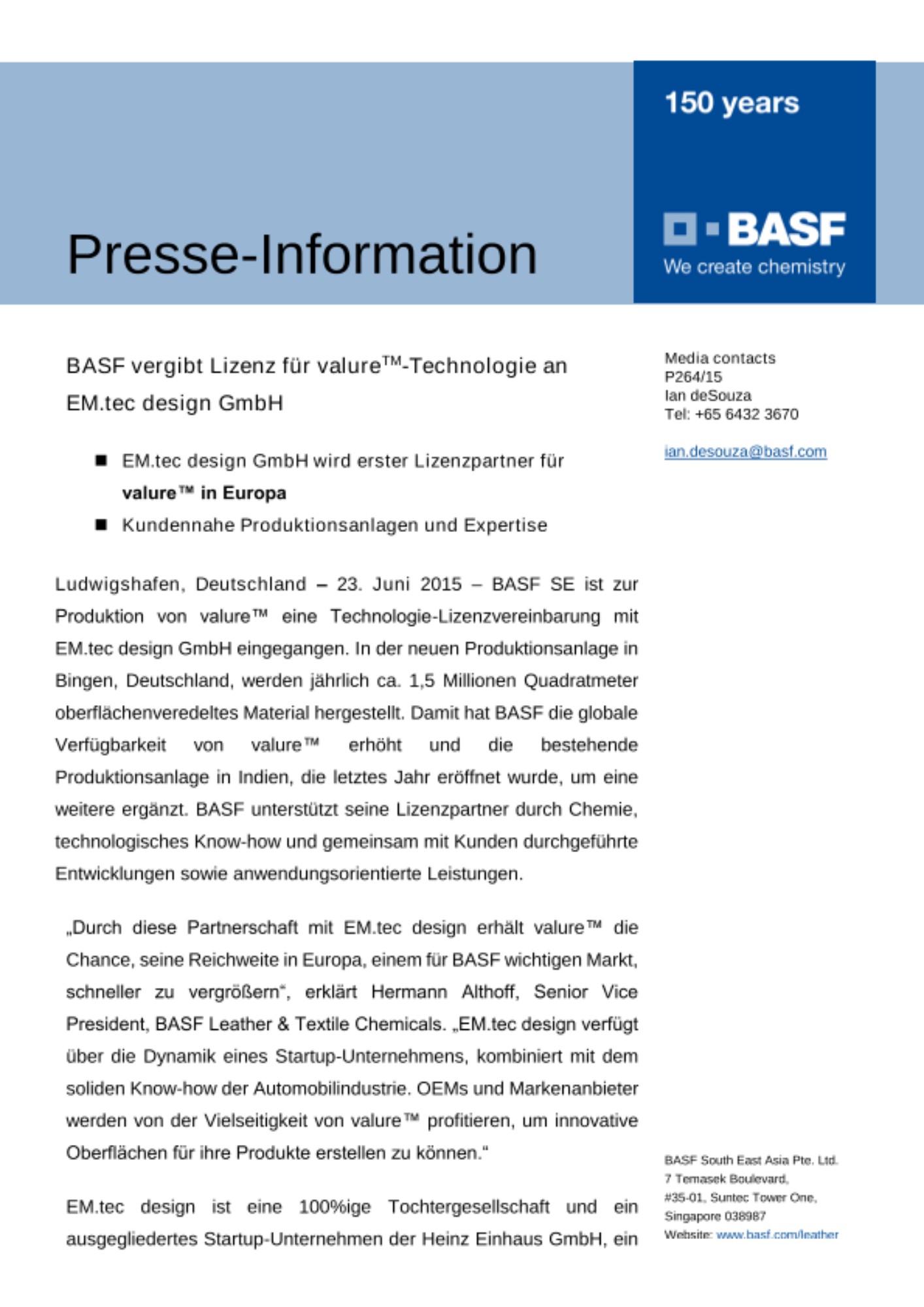 Ludwigshafen, Deutschland – 23. Juni 2015 – BASF SE ist zur Produktion von valure™ eine Technologie-Lizenzvereinbarung mit EM.tec design GmbH eingegangen. In der neuen Produktionsanlage in Bingen, Deutschland, werden jährlich ca. 1,5 Millionen Quadratmeter oberflächenveredeltes Material hergestellt. Damit hat BASF die globale Verfügbarkeit von valure™ erhöht und die bestehende Produktionsanlage in Indien, die letztes Jahr eröffnet wurde, um eine weitere ergänzt. BASF unterstützt seine Lizenzpartner durch Chemie, technologisches Know-how und gemeinsam mit Kunden durchgeführte Entwicklungen sowie anwendungsorientierte Leistungen.