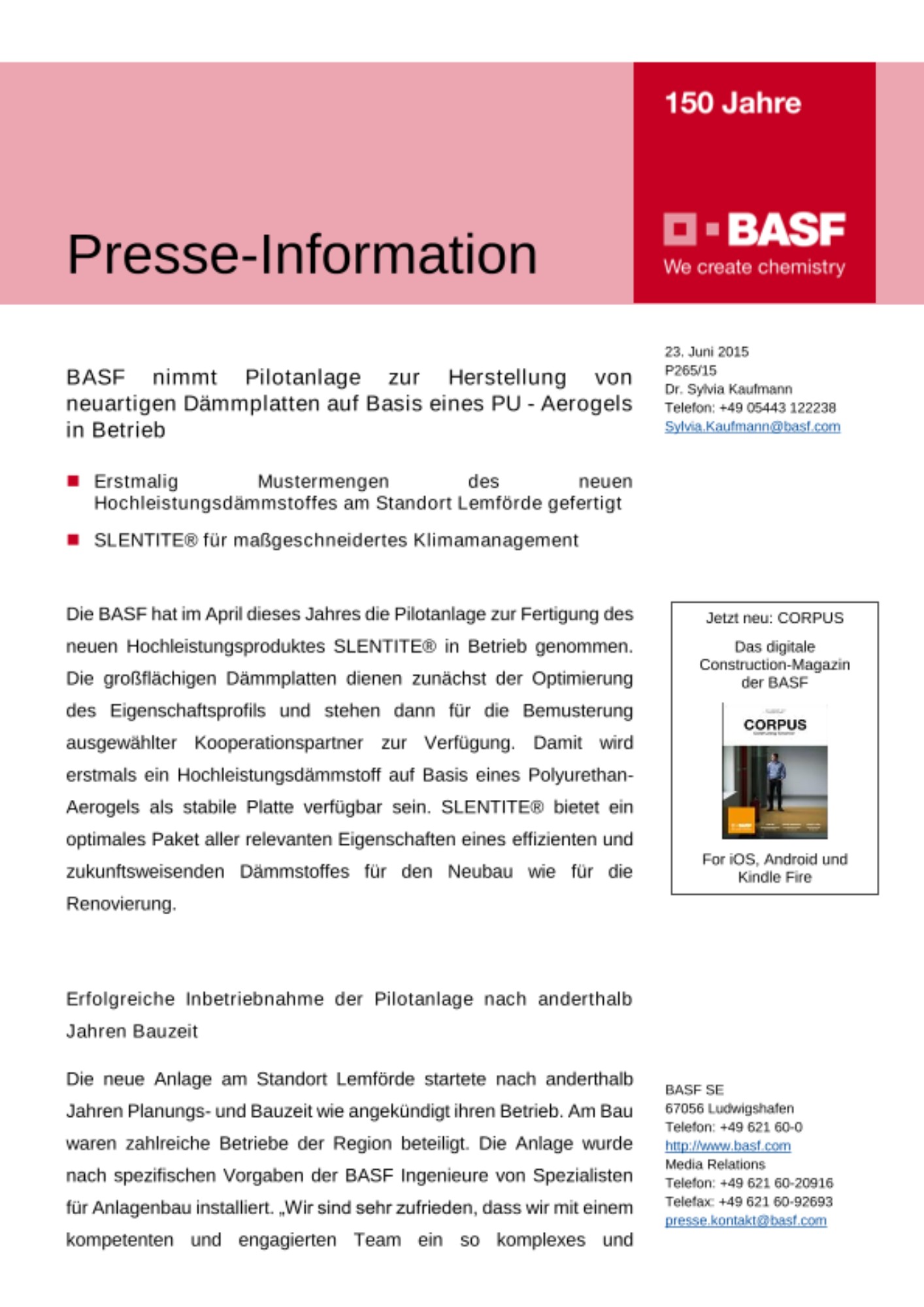 Die neue Anlage am Standort Lemförde startete nach anderthalb Jahren Planungs- und Bauzeit wie angekündigt ihren Betrieb. Am Bau waren zahlreiche Betriebe der Region beteiligt. Die Anlage wurde nach spezifischen Vorgaben der BASF Ingenieure von Spezialisten für Anlagenbau installiert. „Wir sind sehr zufrieden, dass wir mit einem kompetenten und engagierten Team ein so komplexes und neuartiges Projekt planmäßig umsetzen konnten.“, so Dr. Hermann Bergmann, Gruppenleiter Polyurethan Forschung. „Jetzt geht es darum, den Herstellungsprozess weiter auszuarbeiten.“ Auch Dr. René Lochtman, Geschäftsführer BASF Polyurethanes GmbH, betont die erfolgreiche Entwicklung von der Labor- in die Pilotphase: “Durch Investitionen in neue Technologien wie die SLENTITE® - Pilotanlage können wir unsere sehr gute Position auf dem Dämmstoffmarkt ausbauen und stärken den Standort Lemförde.“