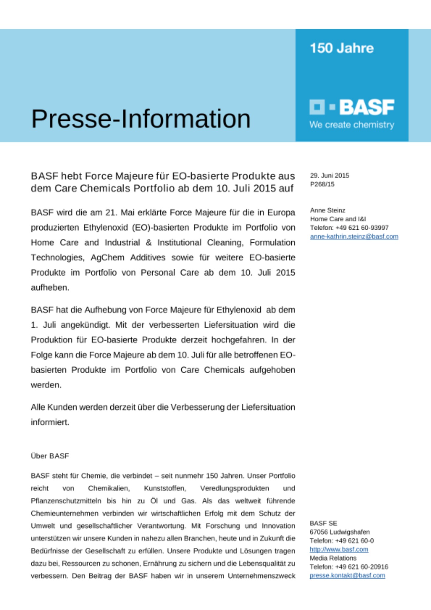 BASF hebt Force Majeure für EO-basierte Produkte aus dem Care Chemicals Portfolio ab dem 10. Juli 2015 auf