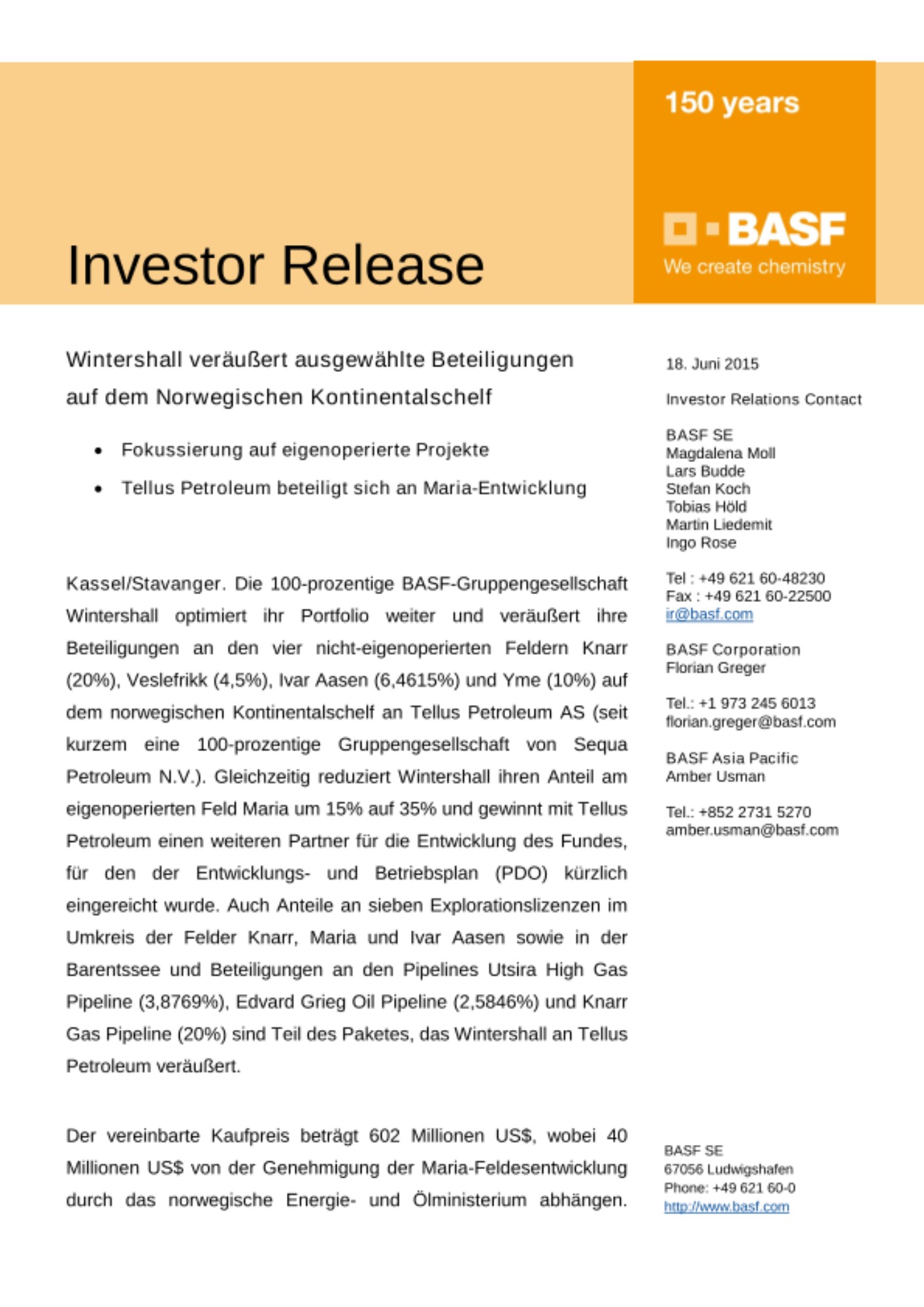 Wintershall veräußert ausgewählte Beteiligungen auf dem Norwegischen Kontinentalschelf
