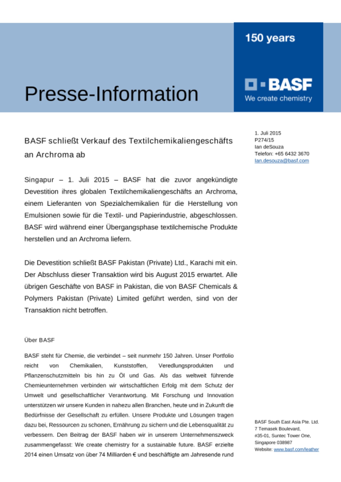 Singapur – 1. Juli 2015 – BASF hat die zuvor angekündigte Devestition ihres globalen Textilchemikaliengeschäfts an Archroma, einem Lieferanten von Spezialchemikalien für die Herstellung von Emulsionen sowie für die Textil- und Papierindustrie, abgeschlossen. BASF wird während einer Übergangsphase textilchemische Produkte herstellen und an Archroma liefern.