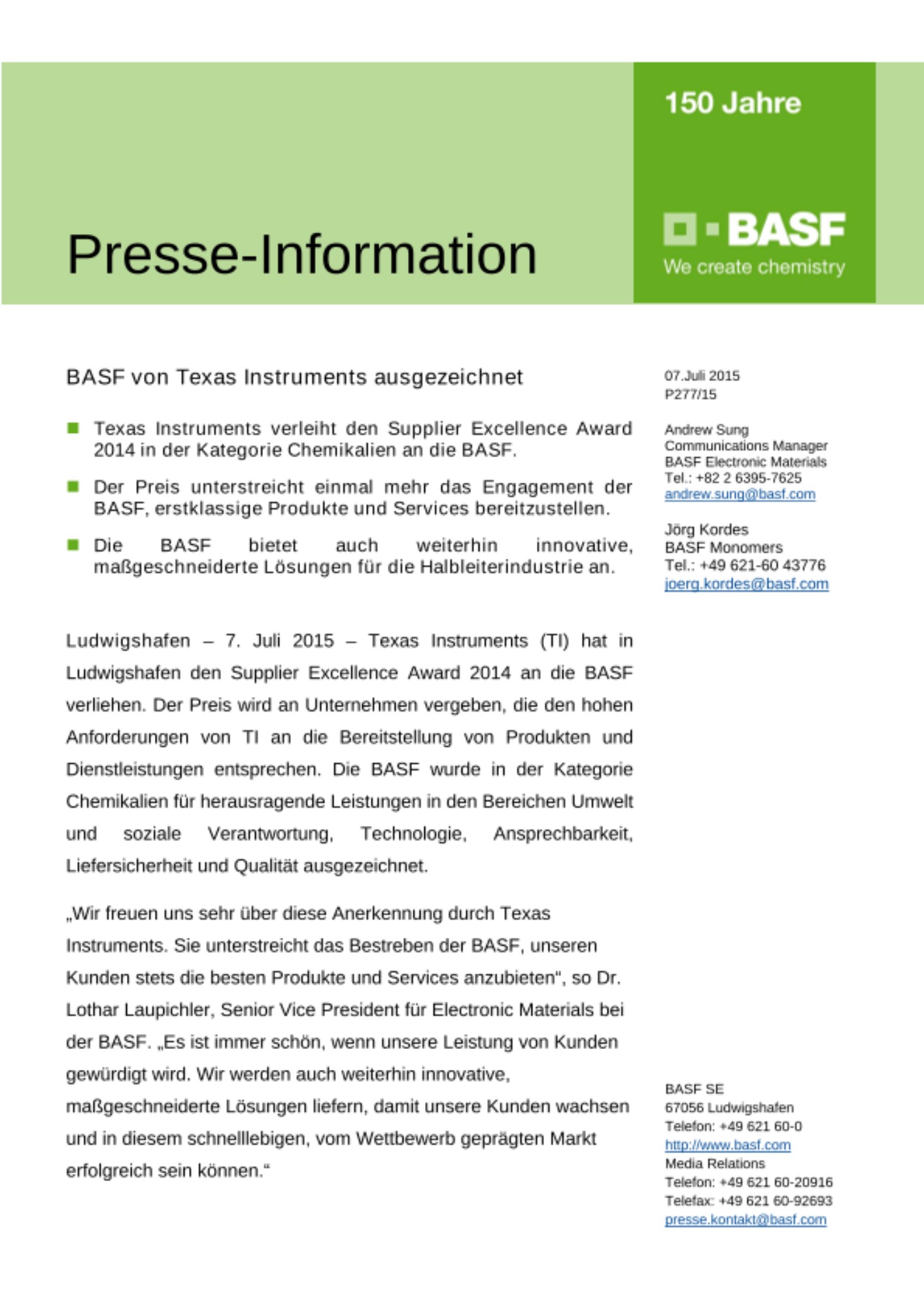 - Texas Instruments verleiht den Supplier Excellence Award 2014 in der Kategorie Chemikalien an die BASF.