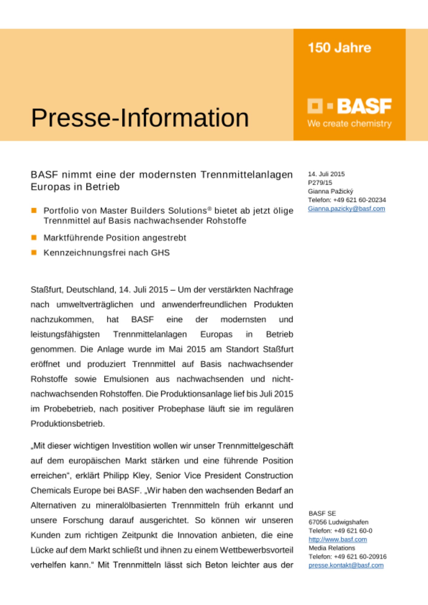 Staßfurt, Deutschland, 14. Juli 2015 – Um der verstärkten Nachfrage nach umweltverträglichen und anwenderfreundlichen Produkten nachzukommen, hat BASF eine der modernsten und leistungsfähigsten Trennmittelanlagen Europas in Betrieb genommen. Die Anlage wurde im Mai 2015 am Standort Staßfurt eröffnet und produziert Trennmittel auf Basis nachwachsender Rohstoffe sowie Emulsionen aus nachwachsenden und nicht-nachwachsenden Rohstoffen. Die Produktionsanlage lief bis Juli 2015 im Probebetrieb, nach positiver Probephase läuft sie im regulären Produktionsbetrieb.