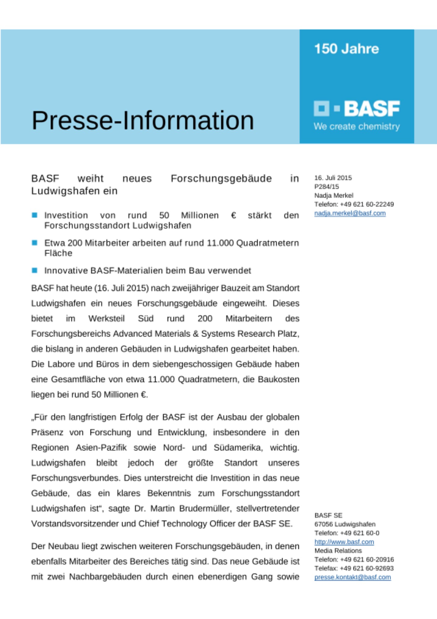 BASF hat heute (16. Juli 2015) nach zweijähriger Bauzeit am Standort Ludwigshafen ein neues Forschungsgebäude eingeweiht. Dieses bietet im Werksteil Süd rund 200 Mitarbeitern des Forschungsbereichs Advanced Materials & Systems Research Platz, die bislang in anderen Gebäuden in Ludwigshafen gearbeitet haben. Die Labore und Büros in dem siebengeschossigen Gebäude haben eine Gesamtfläche von etwa 11.000 Quadratmetern, die Baukosten liegen bei rund 50 Millionen €.