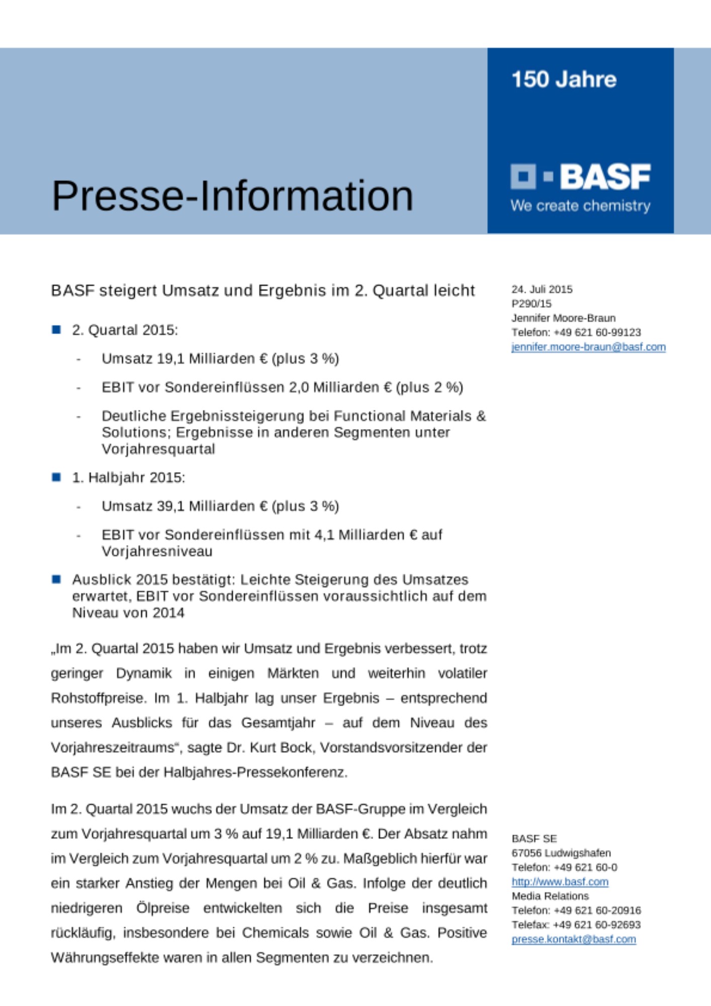Im 2. Quartal 2015 wuchs der Umsatz der BASF-Gruppe im Vergleich zum Vorjahresquartal um 3 % auf 19,1 Milliarden €. Der Absatz nahm im Vergleich zum Vorjahresquartal um 2 % zu. Maßgeblich hierfür war ein starker Anstieg der Mengen bei Oil & Gas. Infolge der deutlich niedrigeren Ölpreise entwickelten sich die Preise insgesamt rückläufig, insbesondere bei Chemicals sowie Oil & Gas. Positive Währungseffekte waren in allen Segmenten zu verzeichnen.